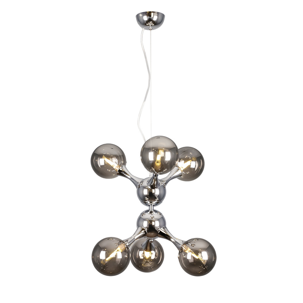 Сучасна підвісна люстра-молекула на шість ламп зі скляними плафонами.