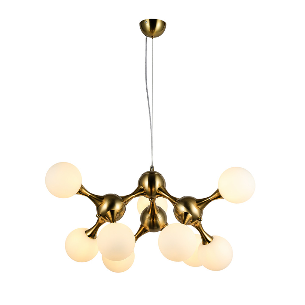 Сучасна підвісна люстра-молекула на дев'ять ламп зі скляними плафонами.
