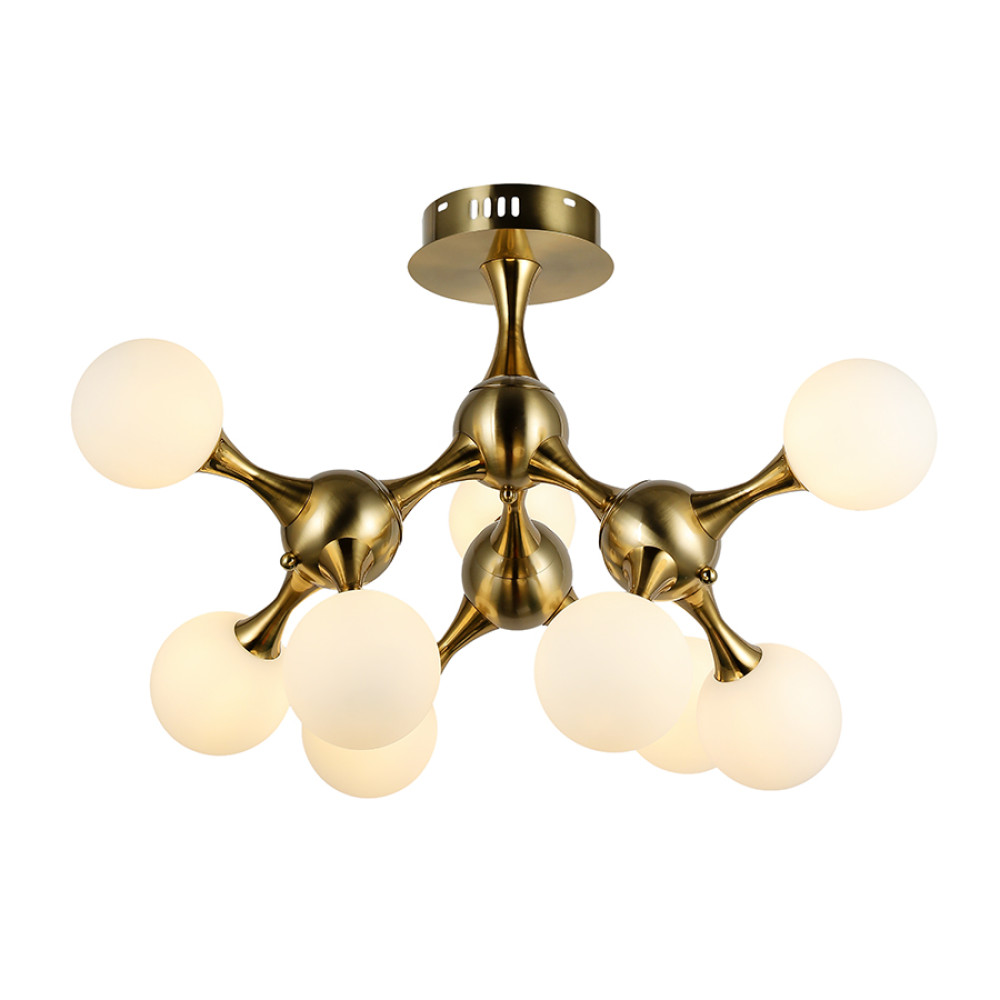 Сучасна стельова люстра-молекула на дев'ять ламп зі скляними плафонами кулями.
