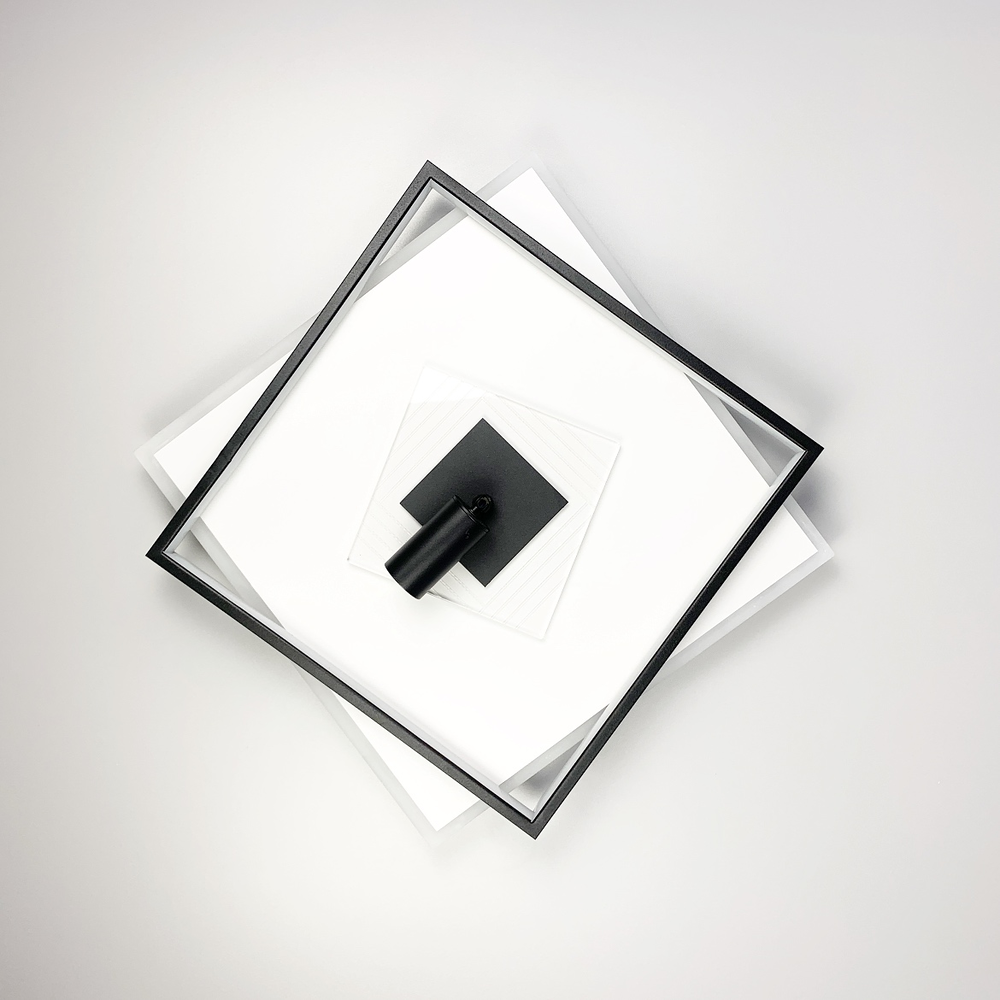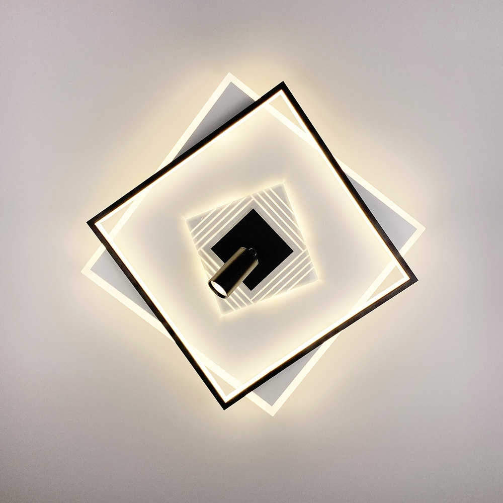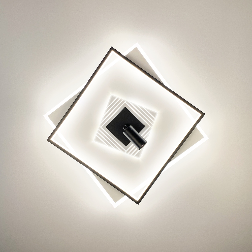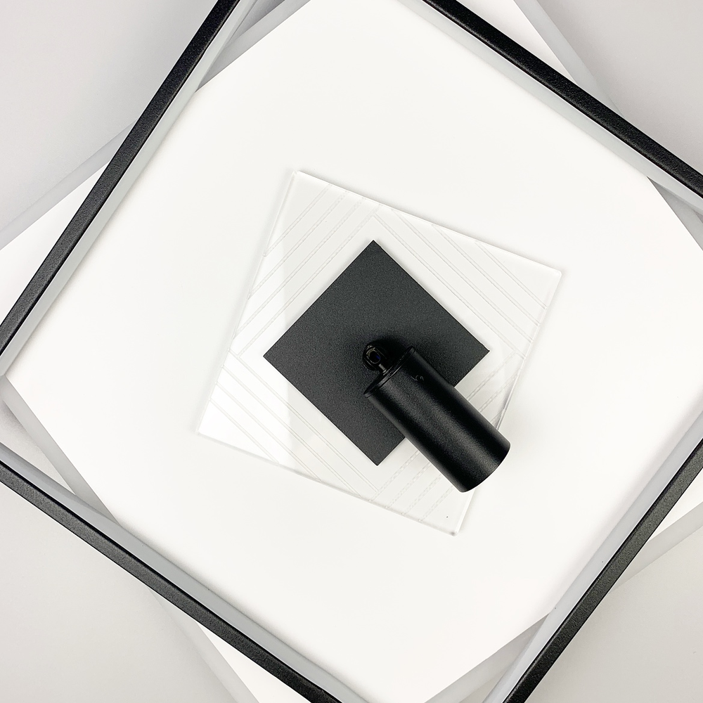 Сучасна стельова світлодіодна LED люстра в чорно-білому корпусі на два джерела світла у вигляді LED квадратів і напрямним спотом (поворотного світильника) циліндричної форми. У комплекті пульт дистанційного керування.