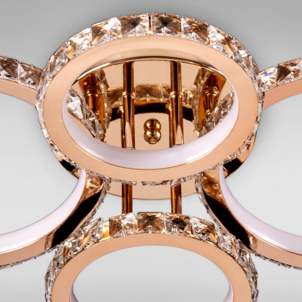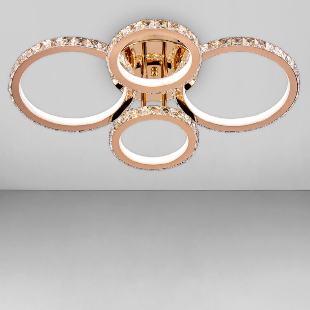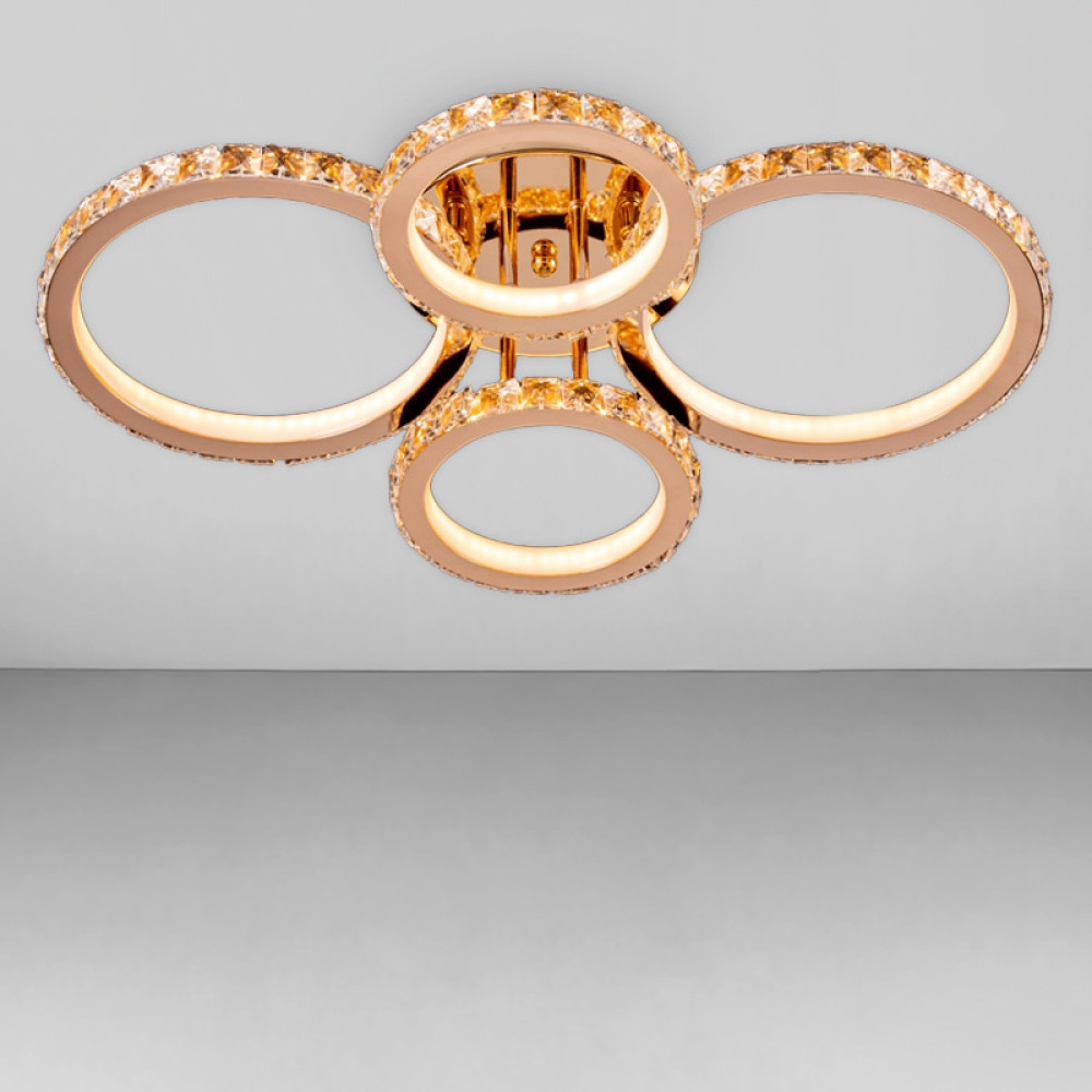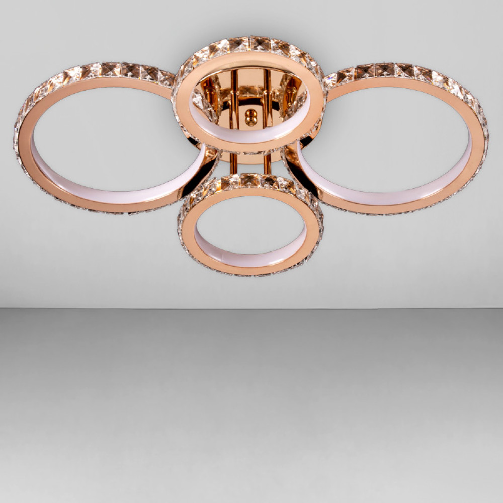 Перед Вами результат поєднання найкращих практик у сучасному освітленні. Світлодіодна люстра має 4 джерела світла з кришталевими елементами, каркас металевий золотого кольору, димер і пульт управління.