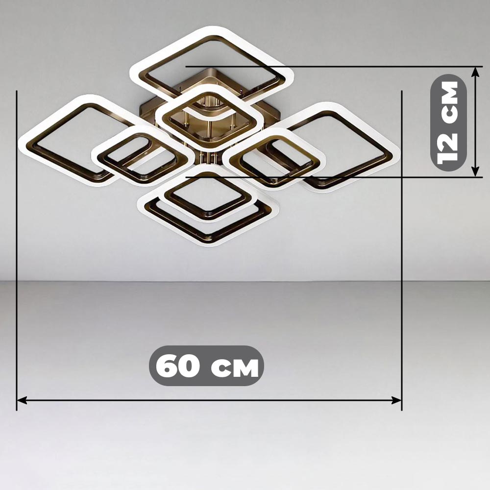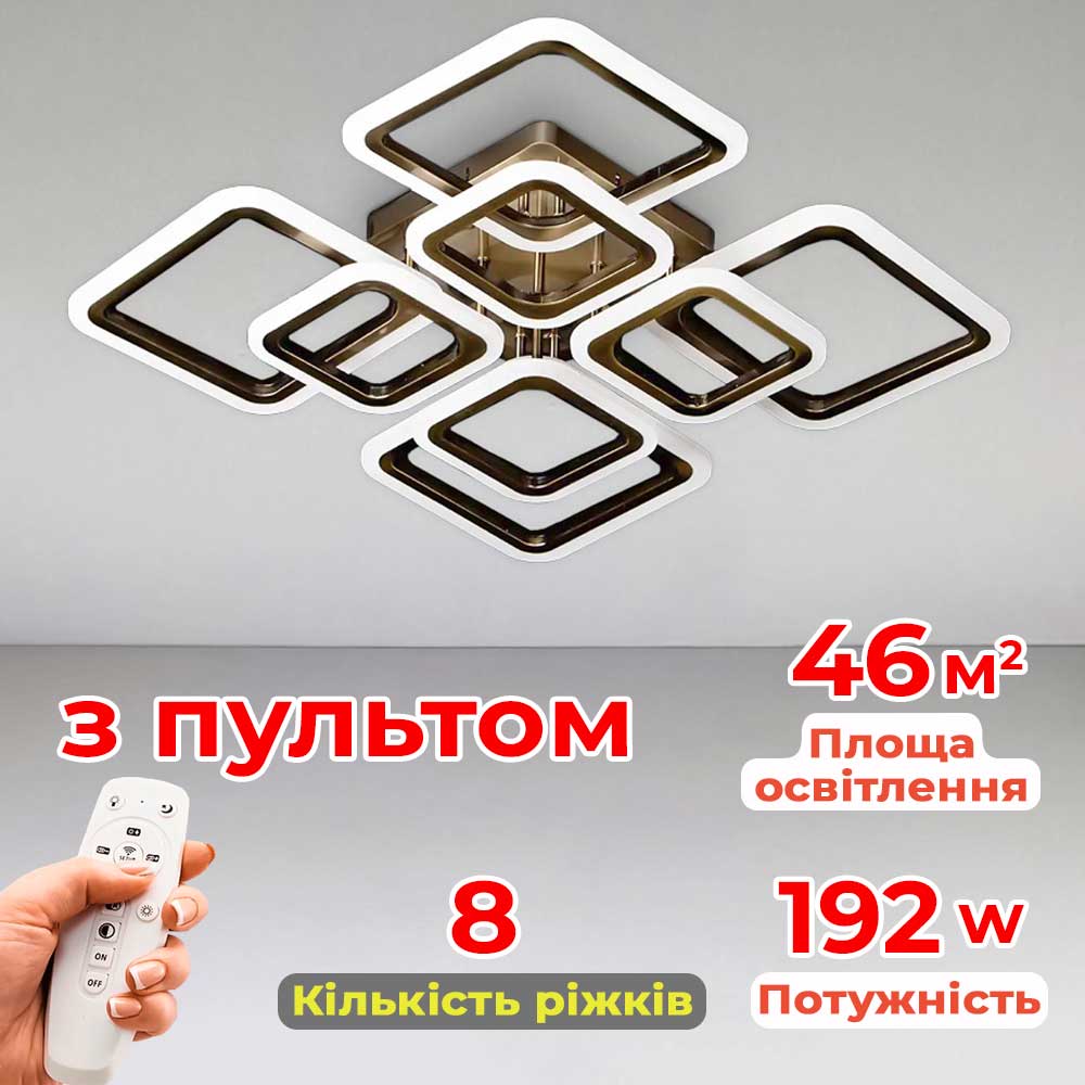 Перед Вами результат поєднання найкращих практик у сучасному освітленні. Люстра має 8 джерел світла у вигляді світлодіодних квадратів.