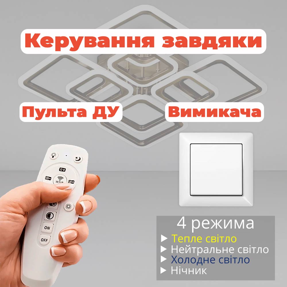 Світлодіодна люстра має кілька режимів: холодний 6000К, нейтральний 4500К, теплий 3000К, LED підсвічування, суміщений режим - будь-яке основне світло плюс світлодіодне підсвічування - все залежить від вашого настрою!