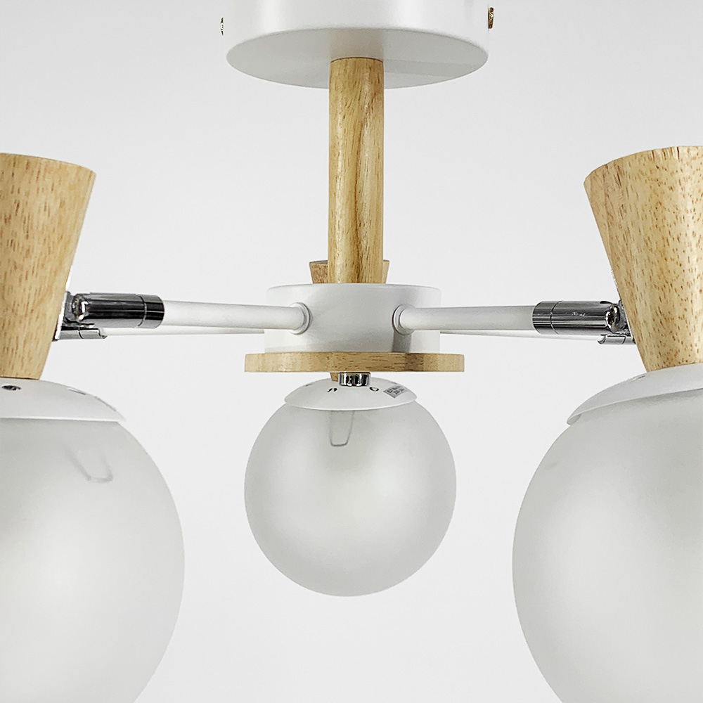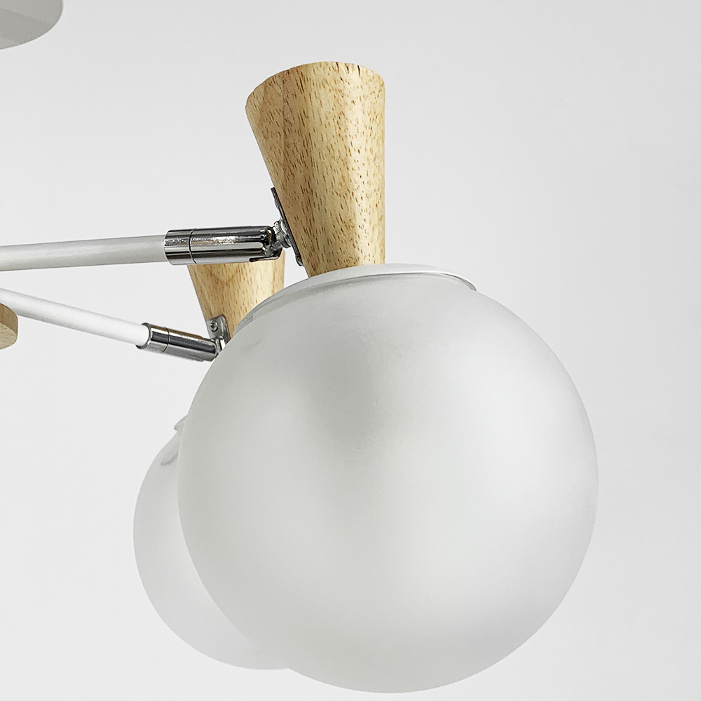 Люстра виконана з металу білого кольору з дерев'яними елементами та фурнітурою кольору хром. Білі матові плафони діаметром плафона 12 см із цоколем Е27. Є регулюючий механізм.