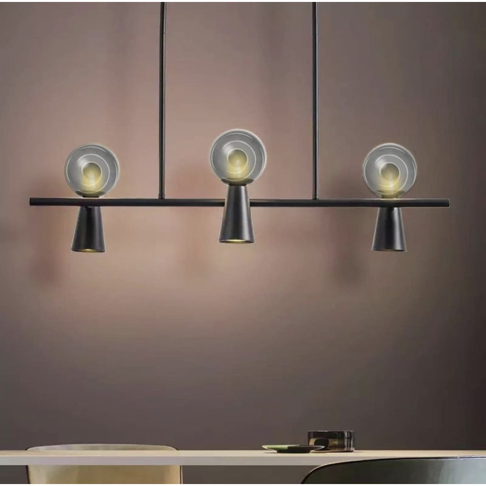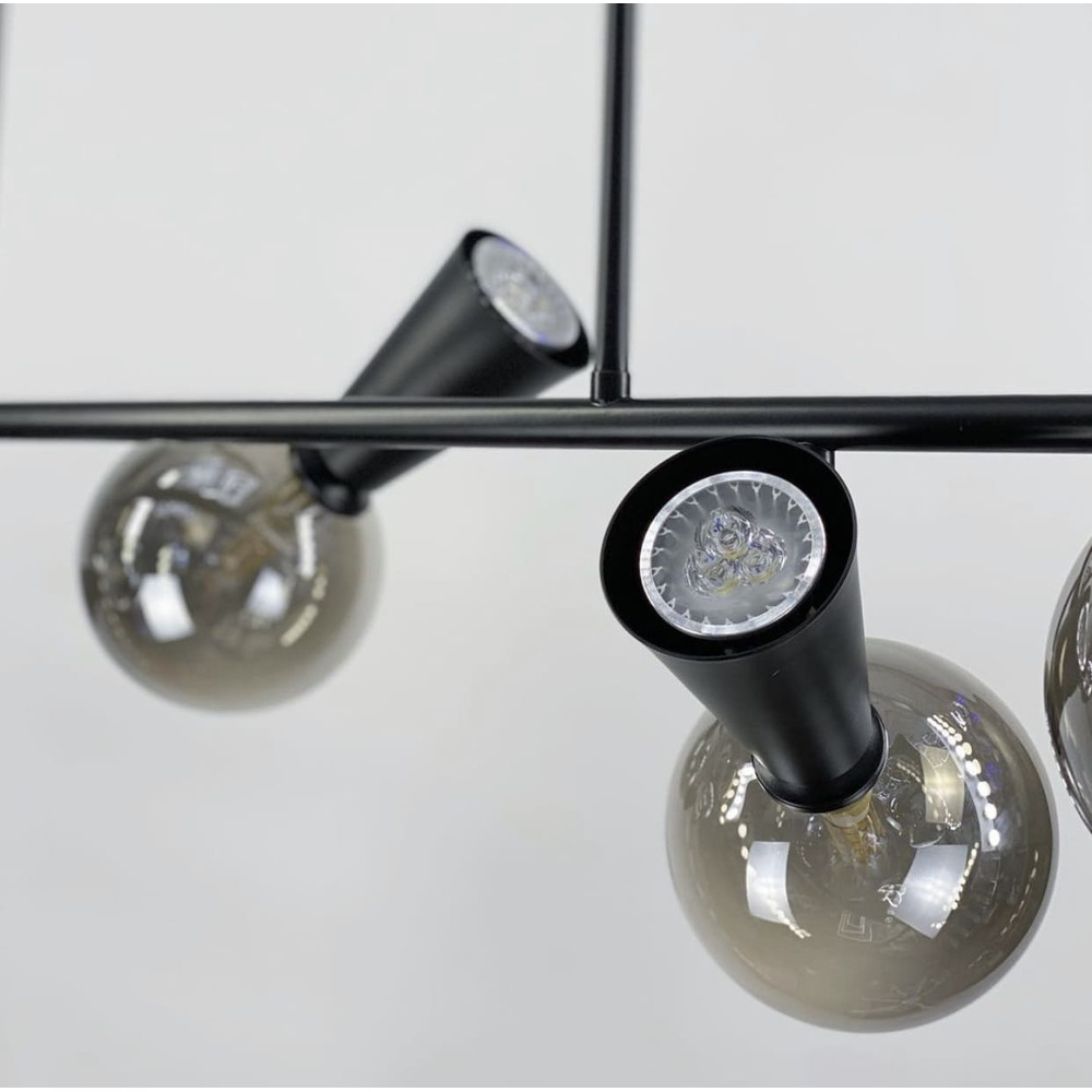 Люстра подовжена у чорному металевому корпусі з трьома плафонами на два джерела світла: скляна плафон-куля (графітового кольору) з цоколем G9 – 3 шт. та металевий плафон у вигляді споту (конусоподібний) з цоколем GU10 – 3 шт.