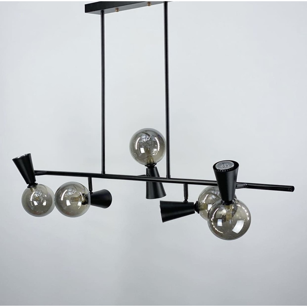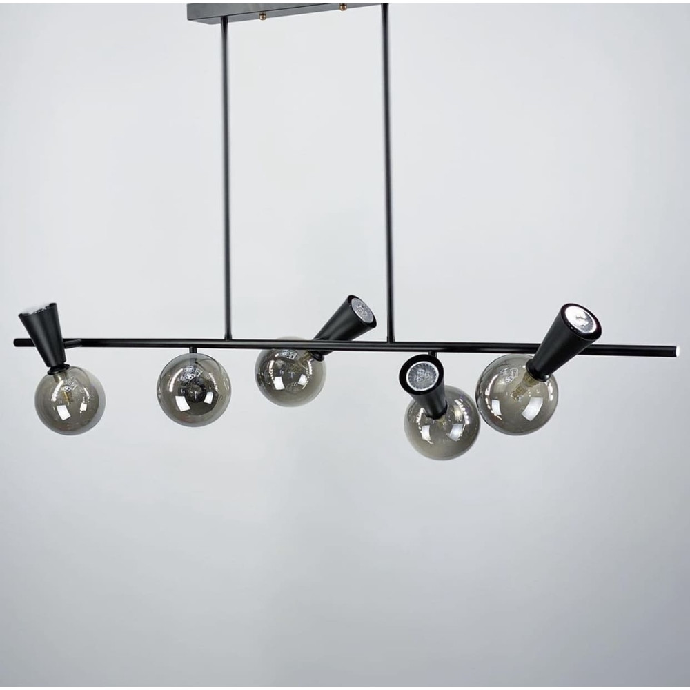 Люстра подовжена у чорному металевому корпусі з 5 плафонами на два джерела світла: скляна плафон-куля (графітового кольору) з цоколем G9 - 5 шт. та металевий плафон у вигляді споту (конусоподібний) з цоколем GU10 - 5 шт. є регулюючий механізм з урахуванням кріплення плафона.