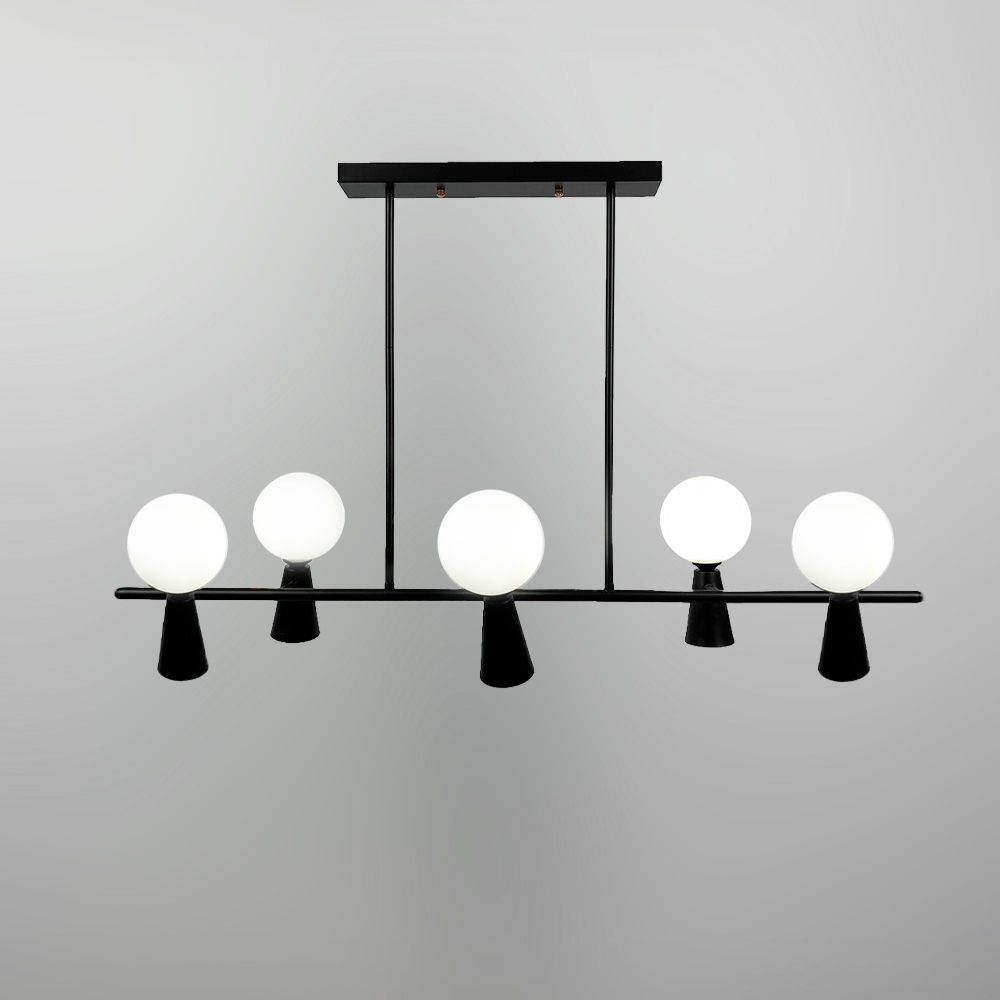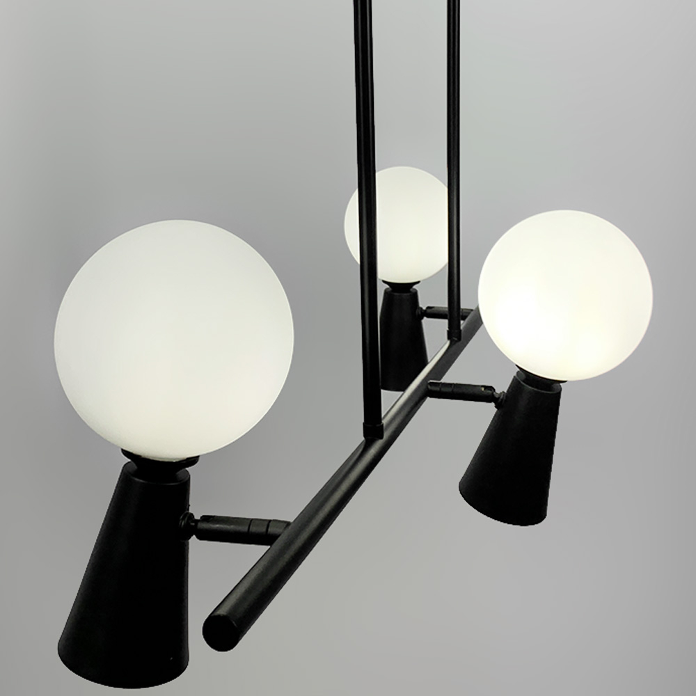 Люстра подовжена у чорному металевому корпусі з 5 плафонами на два джерела світла: скляна плафон-куля (білого кольору) з цоколем G9 - 5 шт. та металевий плафон у вигляді споту (конусоподібний) з цоколем GU10 - 5 шт. є регулюючий механізм з урахуванням кріплення плафона.