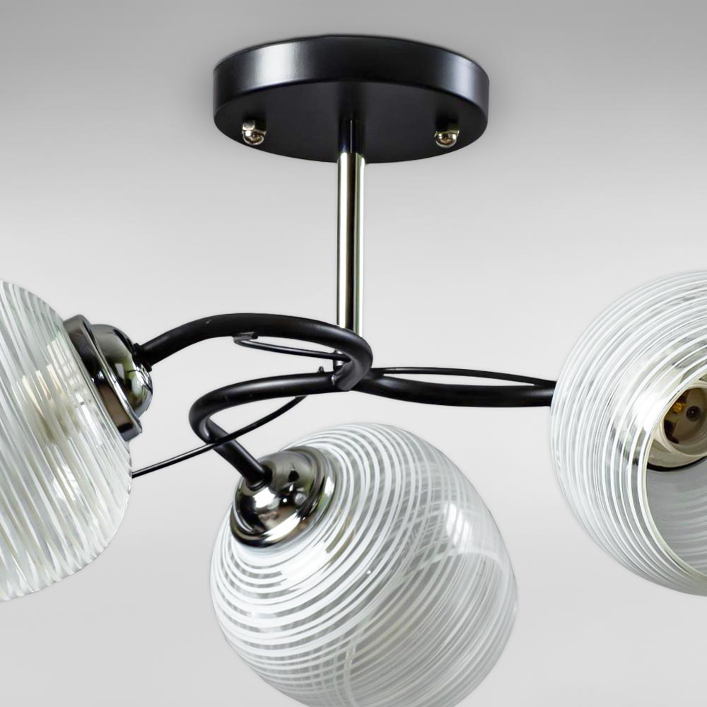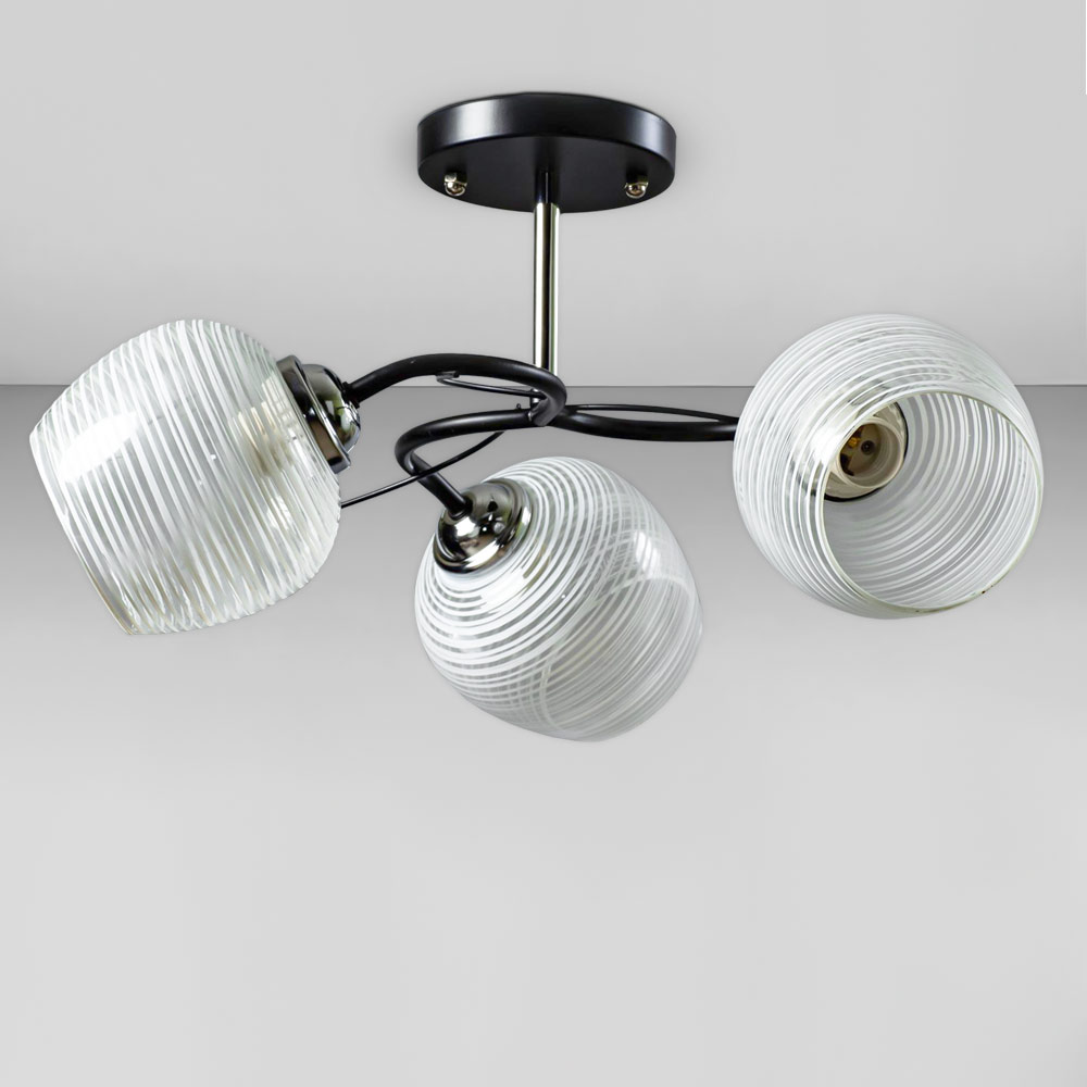 Стильна стельова люстра на три лампи зі скляними декоративними плафонами круглої форми.