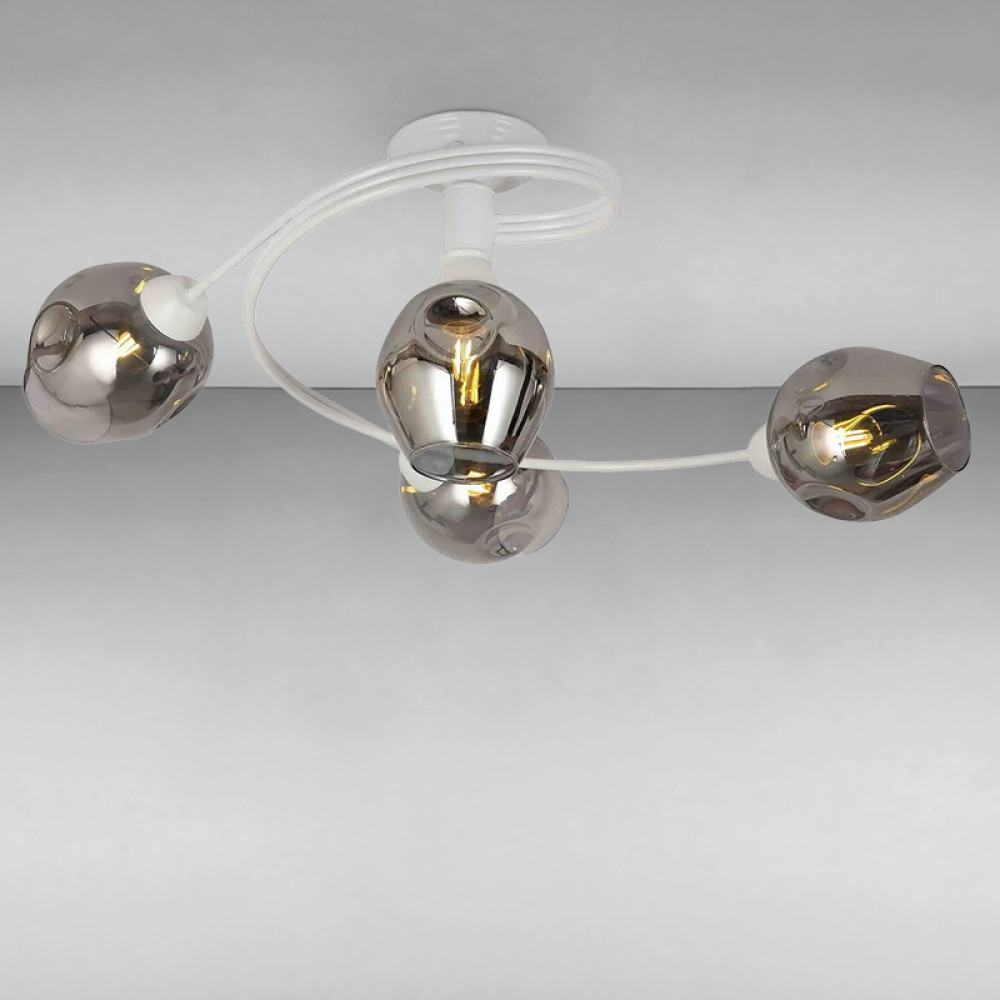 Люстра на четыре лампы в стиле Лофт из белого металла с черными стеклянными плафонами в виде шаров вытянутой формы.
