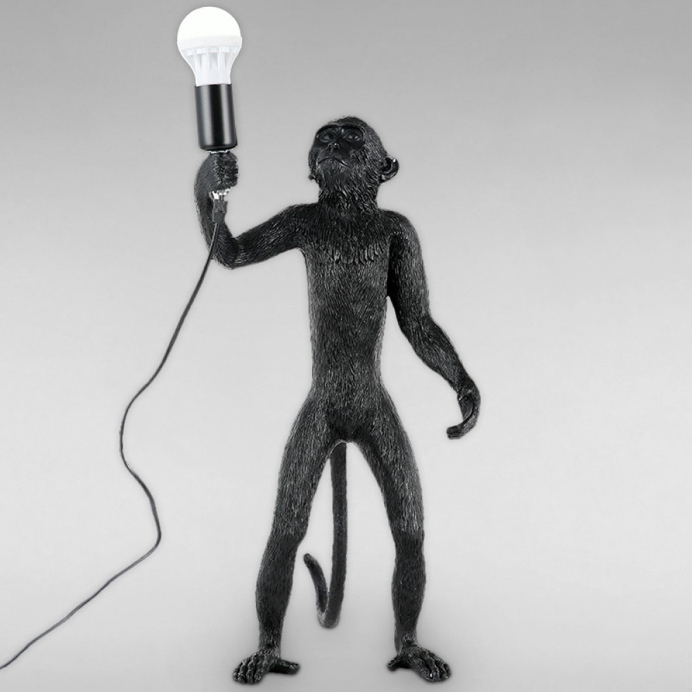 Декоративна настільна лампа на одну лампу у вигляді мавпочки яка стоїть з лампочкою в лапці.