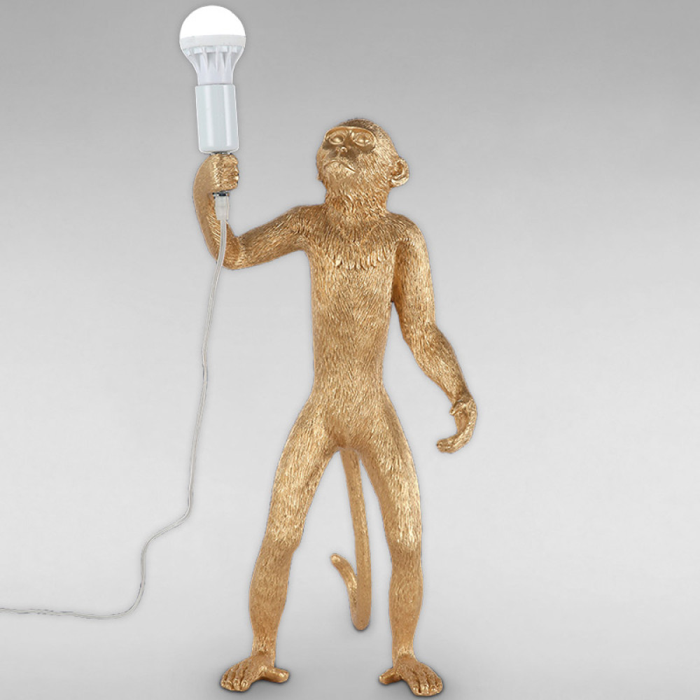 Декоративна настільна лампа на одну лампу у вигляді мавпочки яка стоїть з лампочкою в лапці.