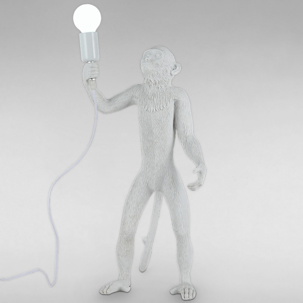 Декоративна настільна лампа на одну лампу у вигляді мавпочки яка стоїть з лампочкою в лапці.