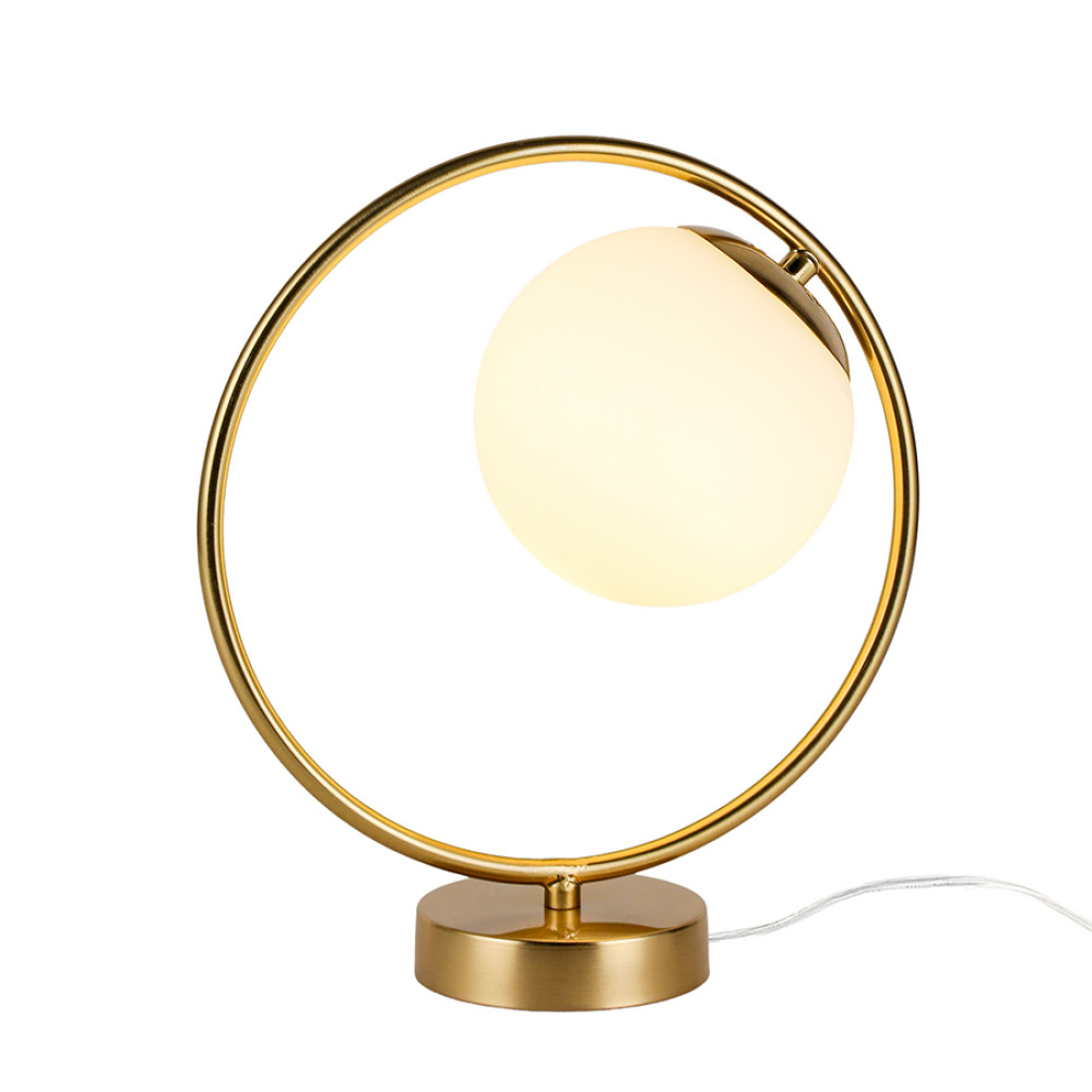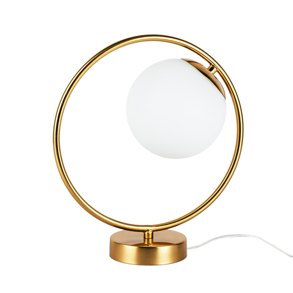 Стильний настільний світильник, сучасна настільна лампа на одне джерело світла зі скляним плафоном-кулею та металевим корпусом у вигляді кільця на круглій плоскій основі. Світильник може використовуватися як приліжкова настільна лампа в спальню або як декоративний елемент підсвічування в будь-якому інтер'єрі. Ця настільна лампа додасть інтер'єру естетики, створить затишну атмосферу і дасть Вам освітлення там, де це потрібно стільки, скільки потрібно!