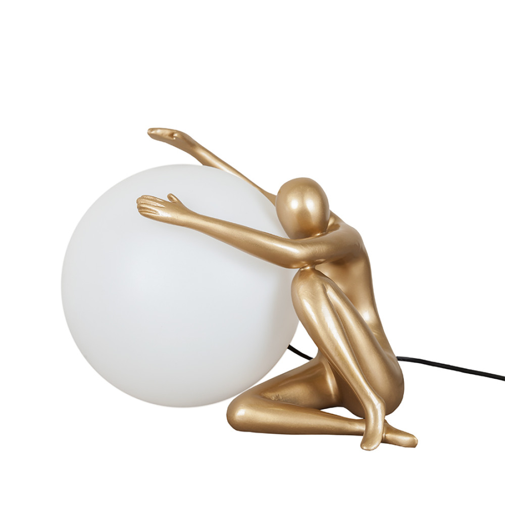 Нестандартна настільна лампа на одну лампочку з плафоном форми кулі та декоративною фігуркою людини.