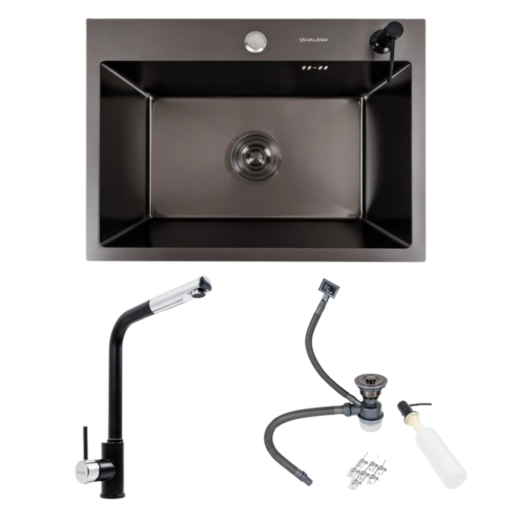 Кухонний комплект: Мийка VALESO Handmade (58x43 см) PVD чорна + Змішувач Q411MB