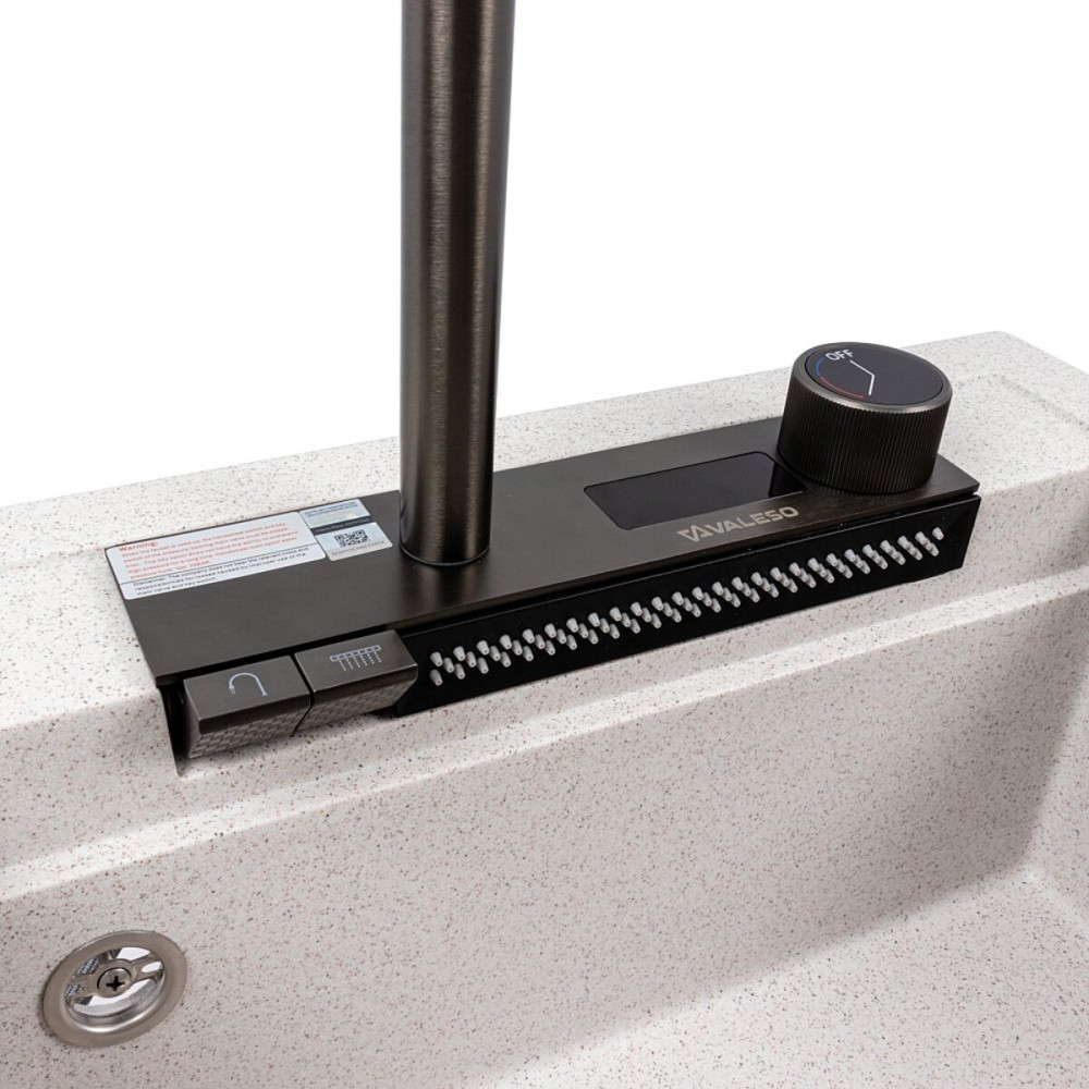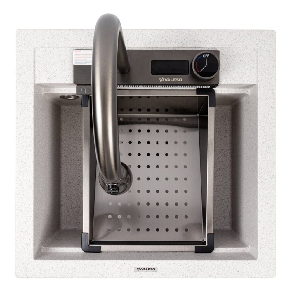 Модель 5149 VIVA від бренду VALESO — це поєднання природної міцності та сучасних технологічних рішень. Головною особливістю цієї моделі є інтегрована система «Водоспад», яка створює широкий та м'який потік води, ідеальний для дбайливого миття продуктів. Мийка комплектується стилізованим змішувачем та функціональним кошиком, що дозволяє створити цілісну та зручну робочу зону. Колір топаз — це теплий, благородний відтінок з легкою текстурою, який додає кухні затишку та вишуканості.