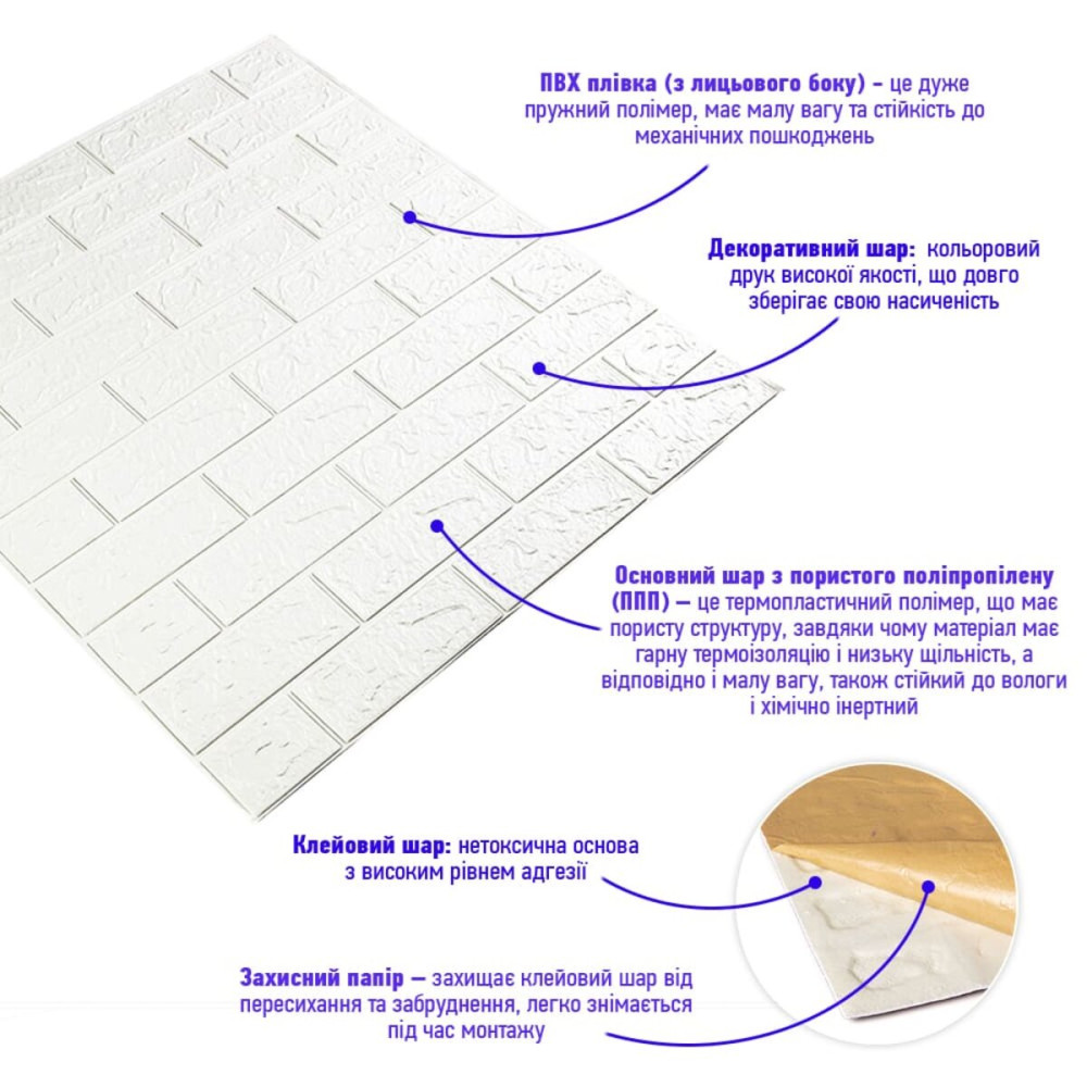 Самоклеючі 3D панелі – декоративне покриття для стін, виконане з легкого та міцного матеріалу – пористого поліпропілену (ППП). Основна особливість - рельєфний малюнок у вигляді цегли в широкій різноманітності колірної гами та наявність клейового шару, що дозволяє встановити панелі без необхідності застосування додаткових матеріалів.