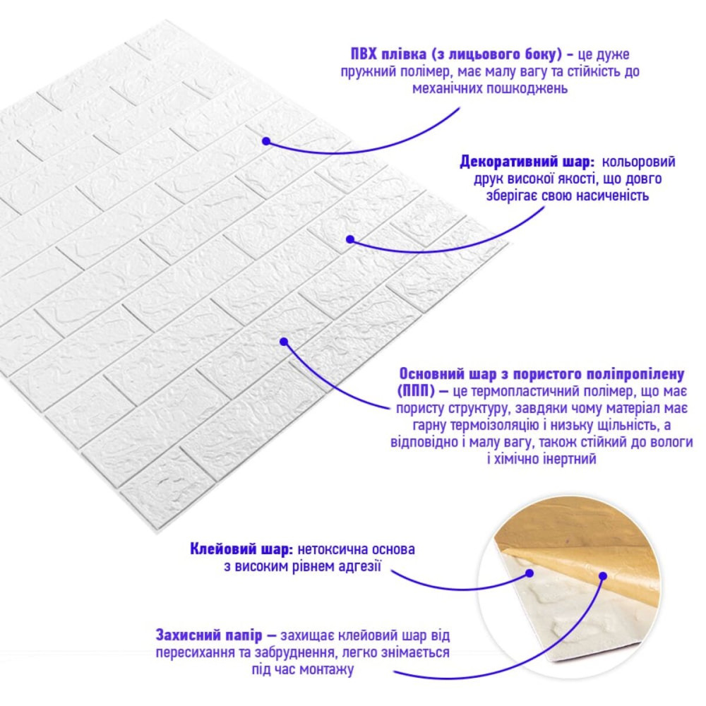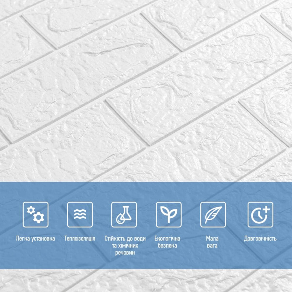Самоклеючі 3D панелі – декоративне покриття для стін, виконане з легкого та міцного матеріалу – пористого поліпропілену (ППП). Основна особливість - рельєфний малюнок у вигляді цегли в широкій різноманітності колірної гами та наявність клейового шару, що дозволяє встановити панелі без необхідності застосування додаткових матеріалів.