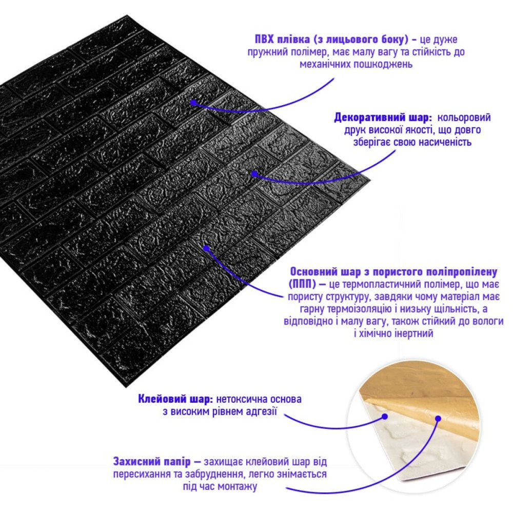 Самоклеючі 3D панелі – декоративне покриття для стін, виконане з легкого та міцного матеріалу – пористого поліпропілену (ППП). Основна особливість - рельєфний малюнок у вигляді цегли в широкій різноманітності колірної гами та наявність клейового шару, що дозволяє встановити панелі без необхідності застосування додаткових матеріалів.