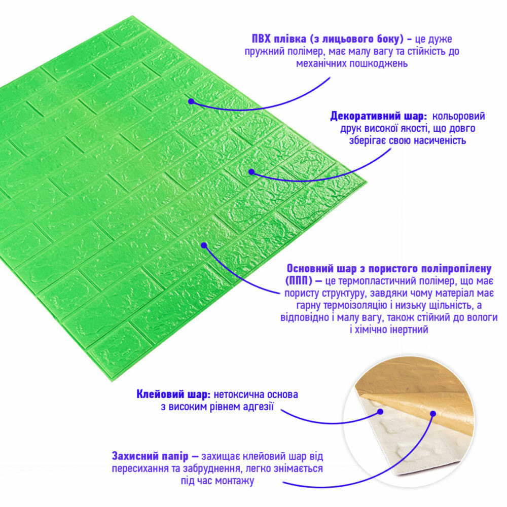 Самоклеючі 3D панелі – декоративне покриття для стін, виконане з легкого та міцного матеріалу – пористого поліпропілену (ППП). Основна особливість - рельєфний малюнок у вигляді цегли в широкій різноманітності колірної гами та наявність клейового шару, що дозволяє встановити панелі без необхідності застосування додаткових матеріалів.