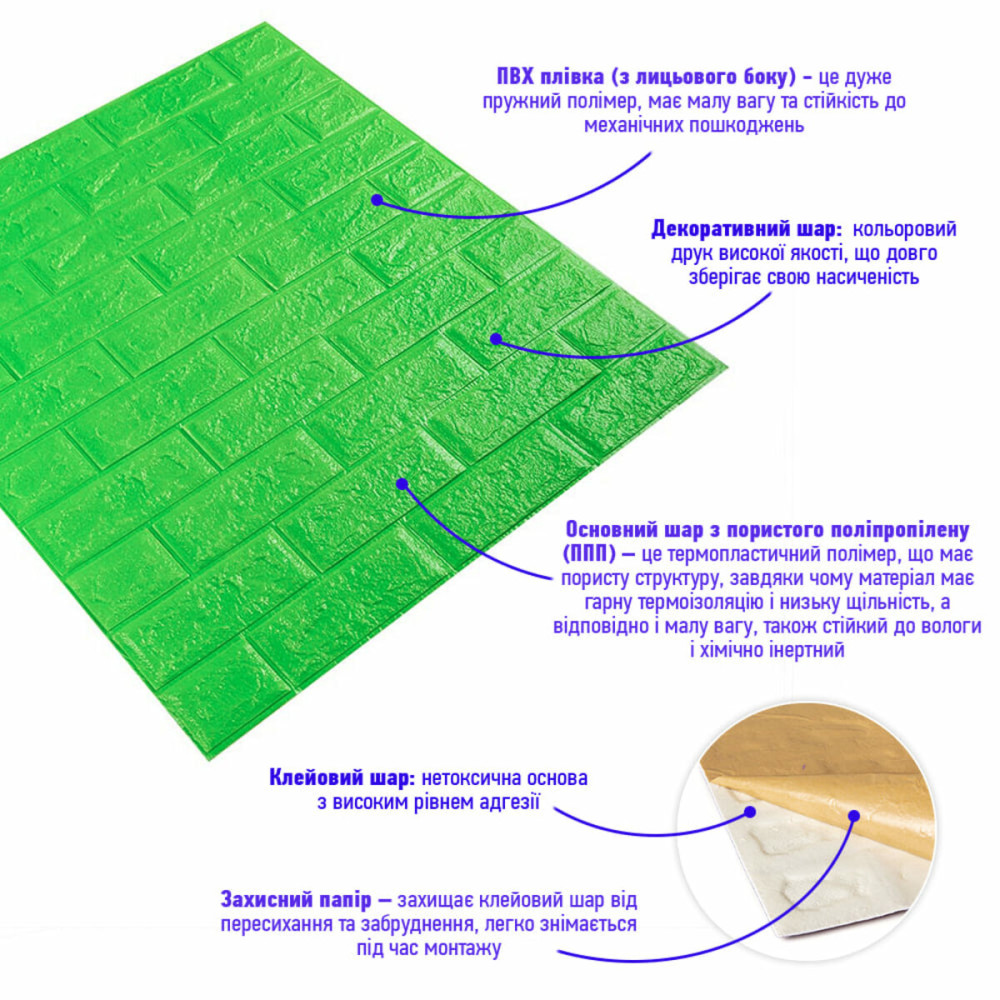 Самоклеючі 3D панелі – декоративне покриття для стін, виконане з легкого та міцного матеріалу – пористого поліпропілену (ППП). Основна особливість - рельєфний малюнок у вигляді цегли в широкій різноманітності колірної гами та наявність клейового шару, що дозволяє встановити панелі без необхідності застосування додаткових матеріалів.
