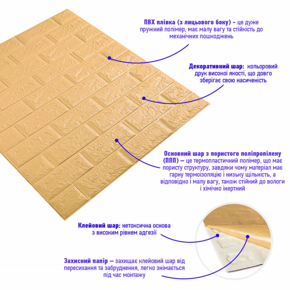Самоклеючі 3D панелі – декоративне покриття для стін, виконане з легкого та міцного матеріалу – пористого поліпропілену (ППП). Основна особливість - рельєфний малюнок у вигляді цегли в широкій різноманітності колірної гами та наявність клейового шару, що дозволяє встановити панелі без необхідності застосування додаткових матеріалів.