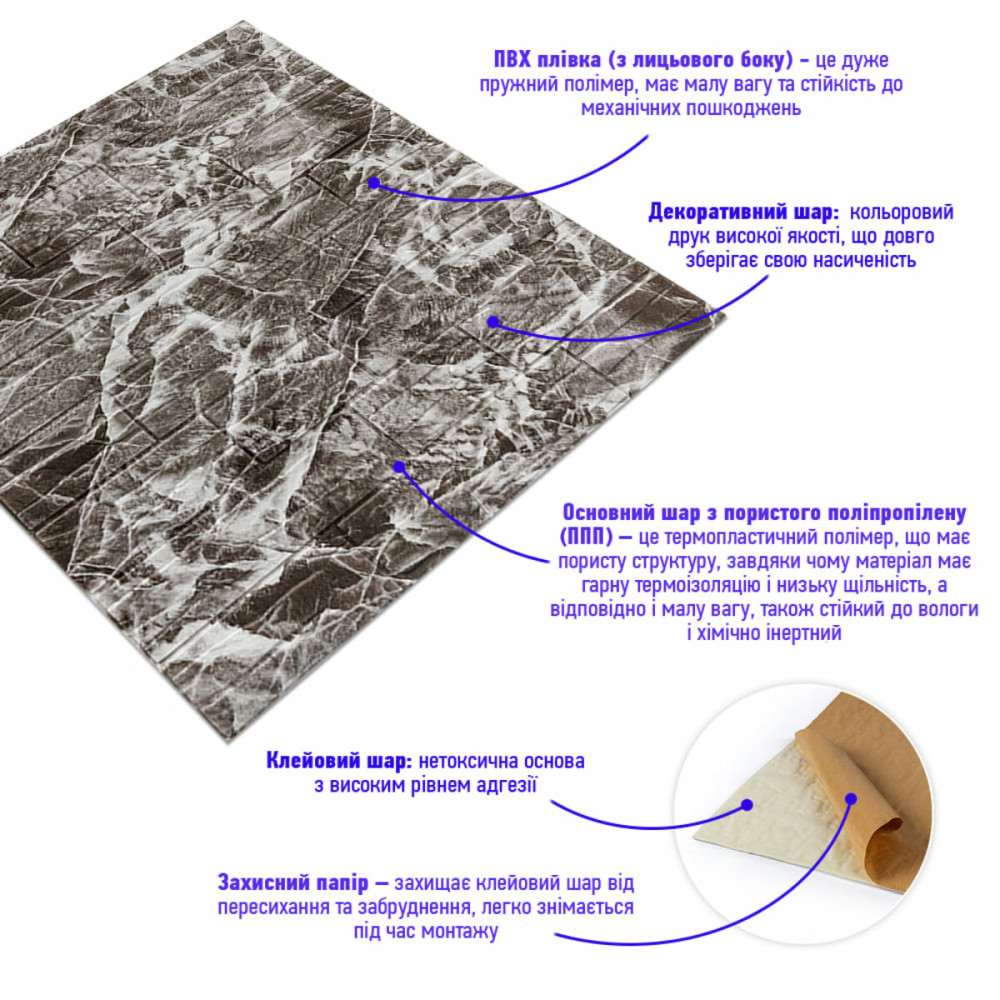 Декоративна панель під камінь "сіра рвана цегла" виготовлена зі спіненого поліпропілену. Це універсальний і щільний матеріал, але водночас легкий. Його термін служби понад 20 років. Самоклеючі 3D панелі з поліпропілену - це швидкий ремонт з мінімумом шуму та будівельного сміття.