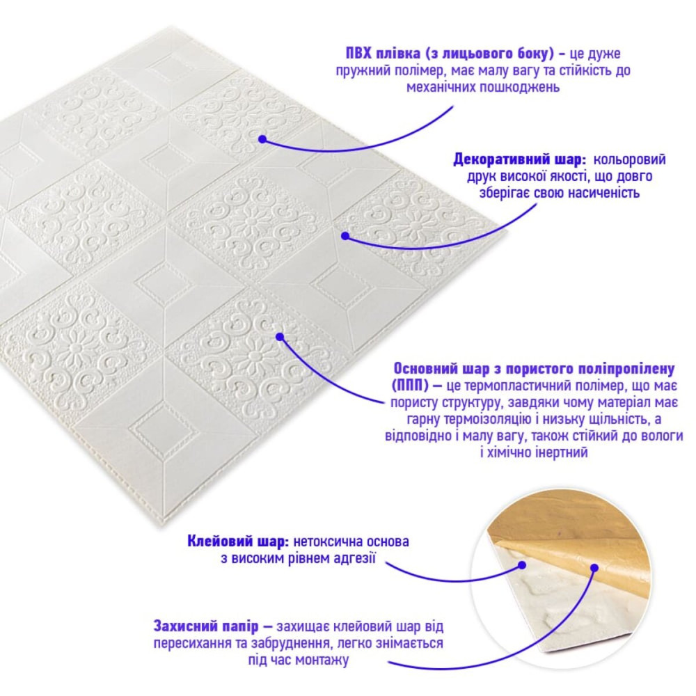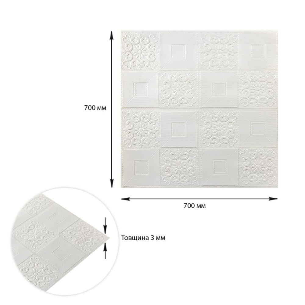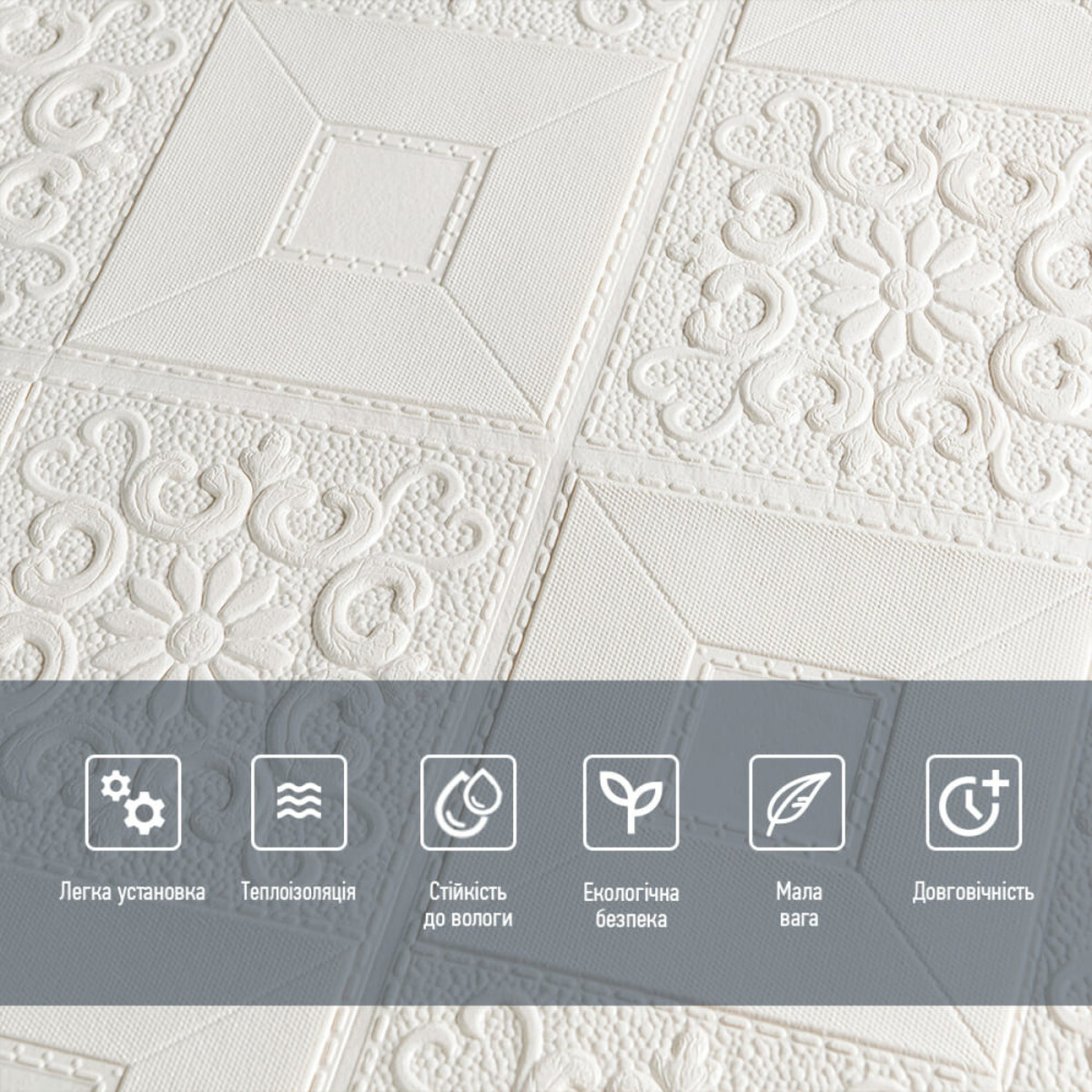 Немає відгуків про товар Самоклеюча декоративна стельова стінна 3D панель 700x700x3мм Білий (114-3) SW-00000697