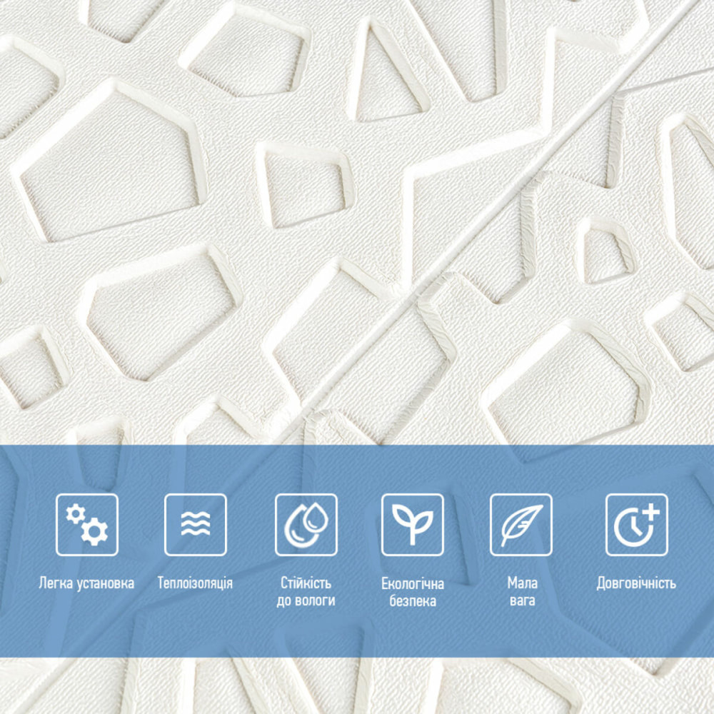 Матеріал панелей — спінений поліпропілен. Це повністю безпечний і нетоксичний матеріал, який має властивості шумопоглинання та утеплення. А широкий вибір дизайнів дозволить зробити ваш інтер’єр унікальним і неповторним.