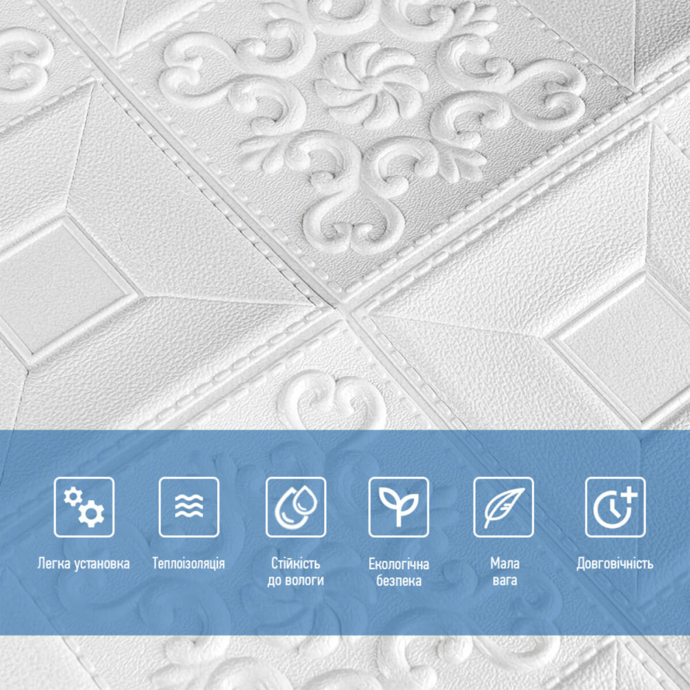 Матеріал панелей — спінений поліпропілен. Це повністю безпечний і нетоксичний матеріал, який має властивості шумопоглинання та утеплення. Широкий вибір візерунків дозволить зробити ваш інтер’єр унікальним і неповторним.