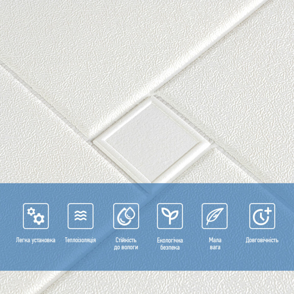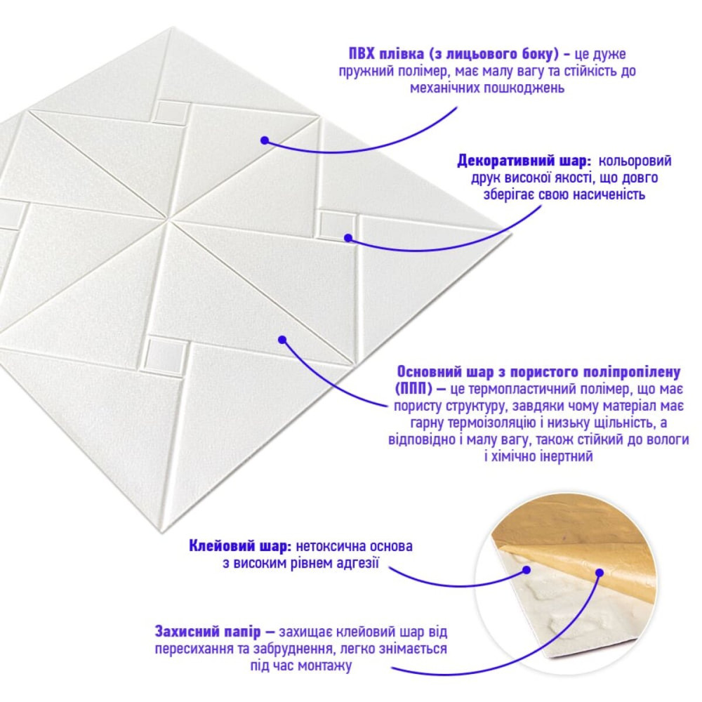 Матеріал панелей – спінений поліпропілен. Це повністю безпечний та нетоксичний матеріал, який має властивості шумопоглинання та утеплення. А широкий вибір малюнків дозволить зробити ваш інтер'єр унікальним та неповторним.