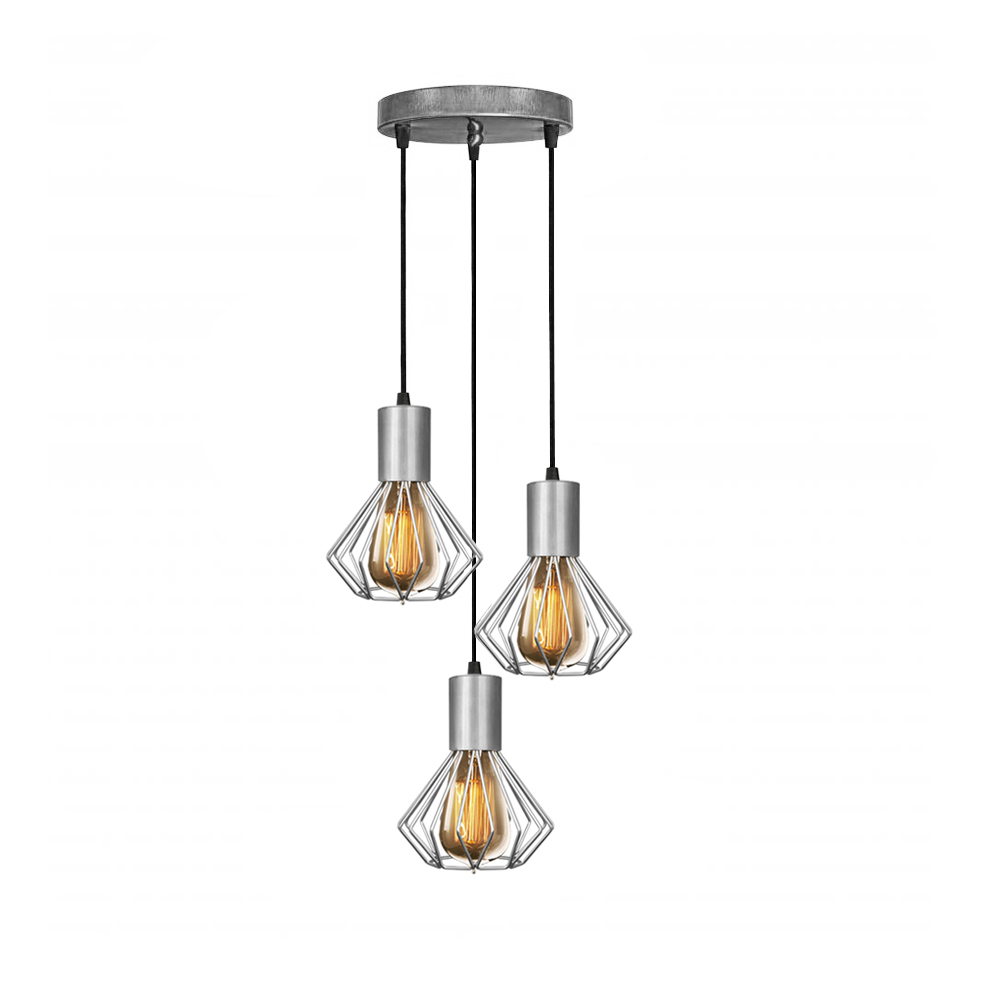 Підвісний світильник у стилі Лофт на три лампи з металевими плафонами конусної форми у вигляді клітки.