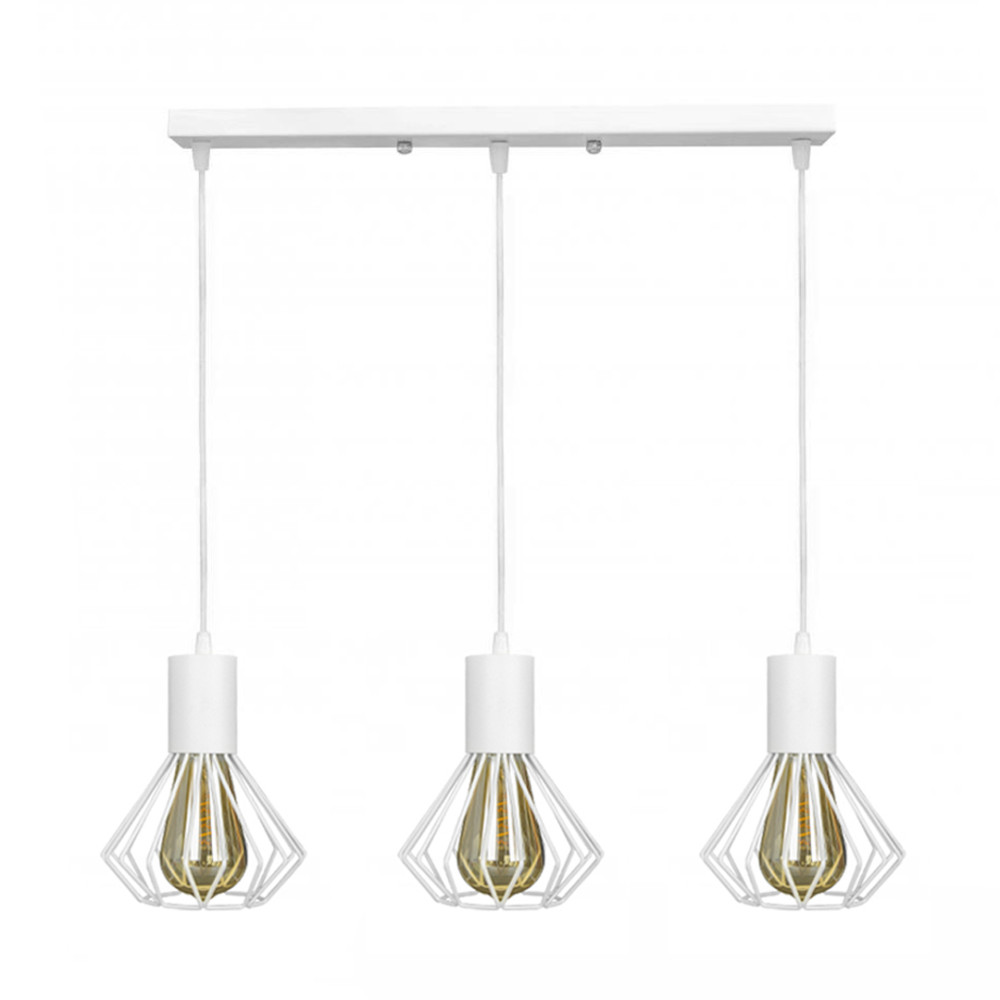 Підвісний світильник у стилі Лофт із довгим прямокутним корпусом, на три лампи з металевими плафонами конусної форми у вигляді клітини.