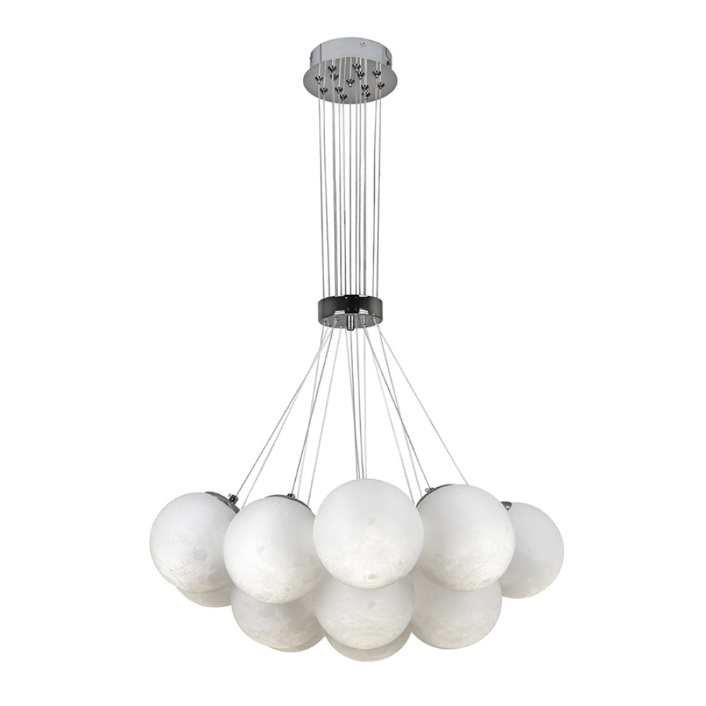 Сучасний декоративний підвісний світильник на тринадцять ламп з плафонами-кулями зібраними в пучок. Пластикові 3D плафони мають незвичайний рельєф поверхні: що цікаво проявляється при включеному джерелі світла, створюючи ефект місячної поверхні.