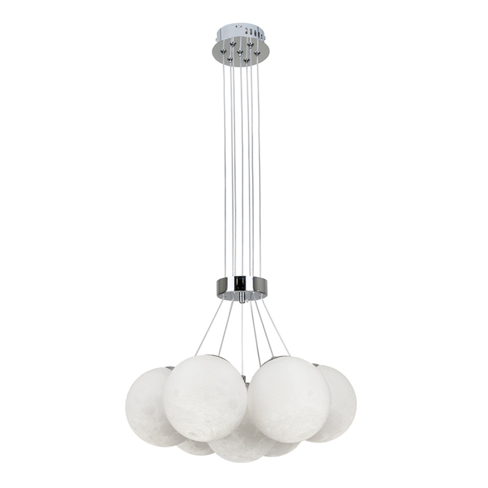 Сучасний декоративний підвісний світильник на сім ламп з плафонами-кулями зібраними в пучок. Пластикові 3D плафони мають незвичайний рельєф поверхні: що цікаво проявляється при включеному джерелі світла, створюючи ефект місячної поверхні.