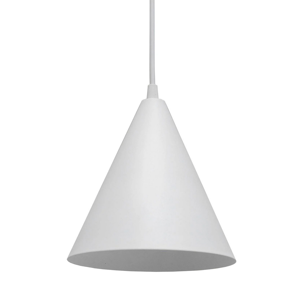 Підвісний світильник на одну лампу має металевий плафон конусної форми, білого кольору. Цей дизайн ідеально вписується в стиль лофт.