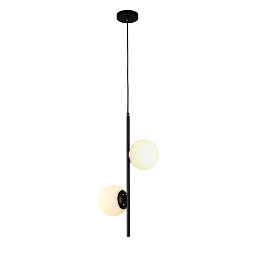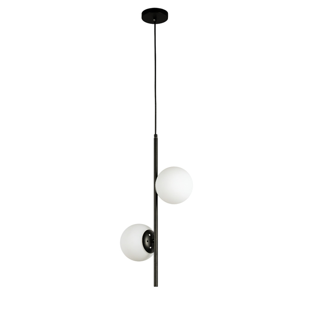 Підвісний світильник на дві лампи у сучасному стилі зі скляними плафонами сферичної форми.