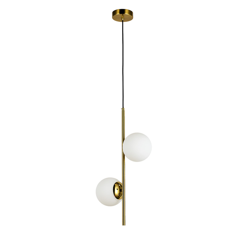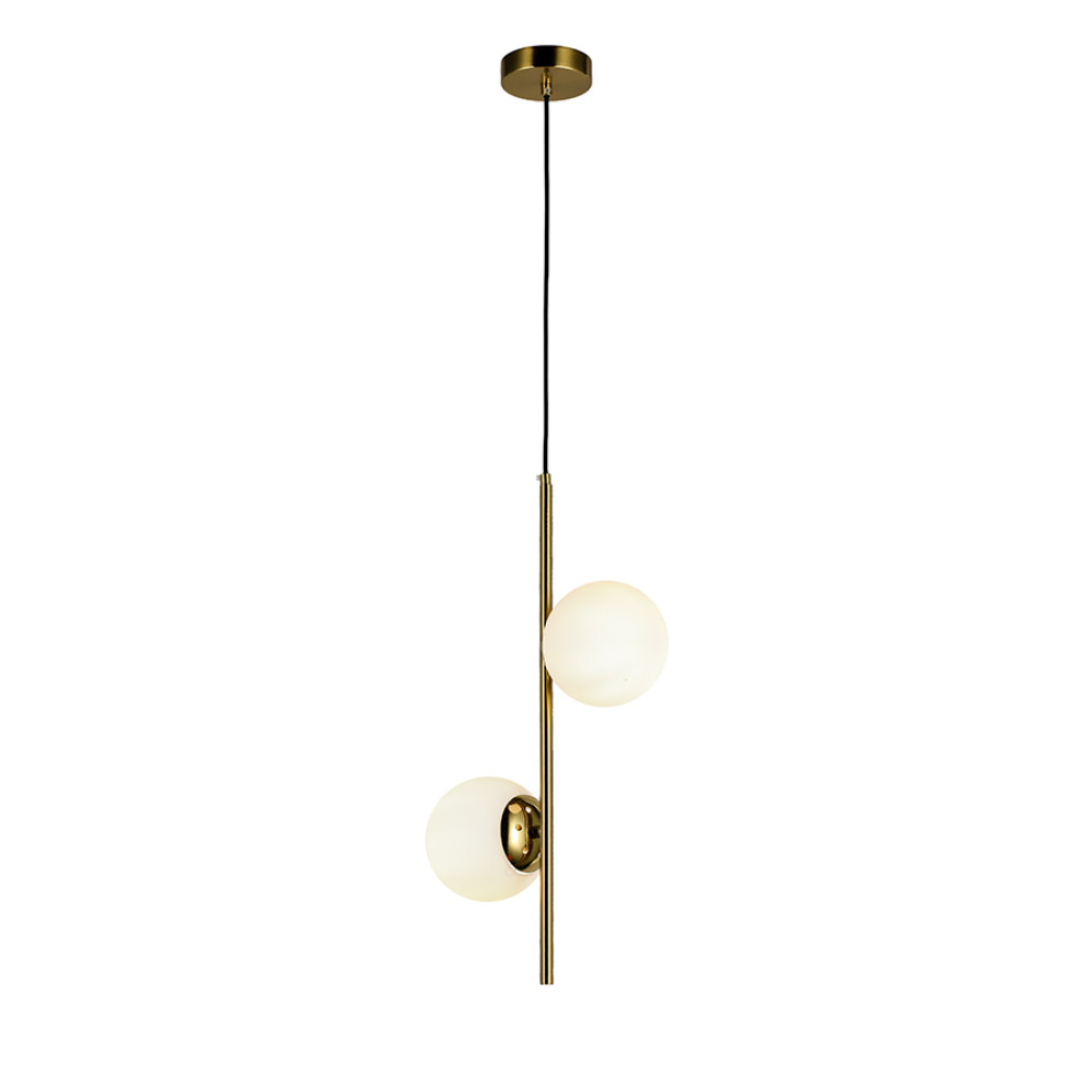 Підвісний світильник на дві лампи у сучасному стилі зі скляними плафонами сферичної форми.