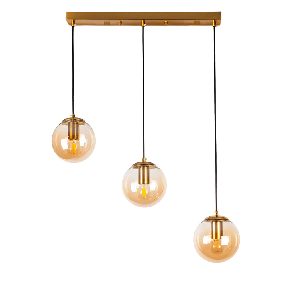 Підвісний світильник у сучасному стилі на три лампи зі скляними плафонами-кулями і довгим прямокутним металевим корпусом. За рахунок різної довжини підвісу для кожного плафона, створюється легкий ступінчастий ефект, відмінно підходить для високих стель.