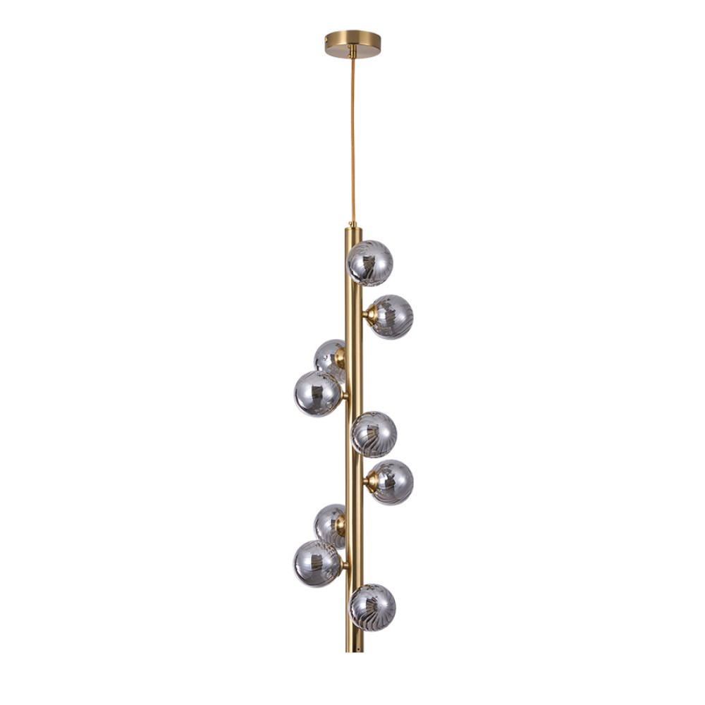 Сучасний стильний підвісний світильник на дев'ять ламп з довгим вертикальним металевим корпусом на якому розташовані скляні плафони-кулі діаметром 8 см.