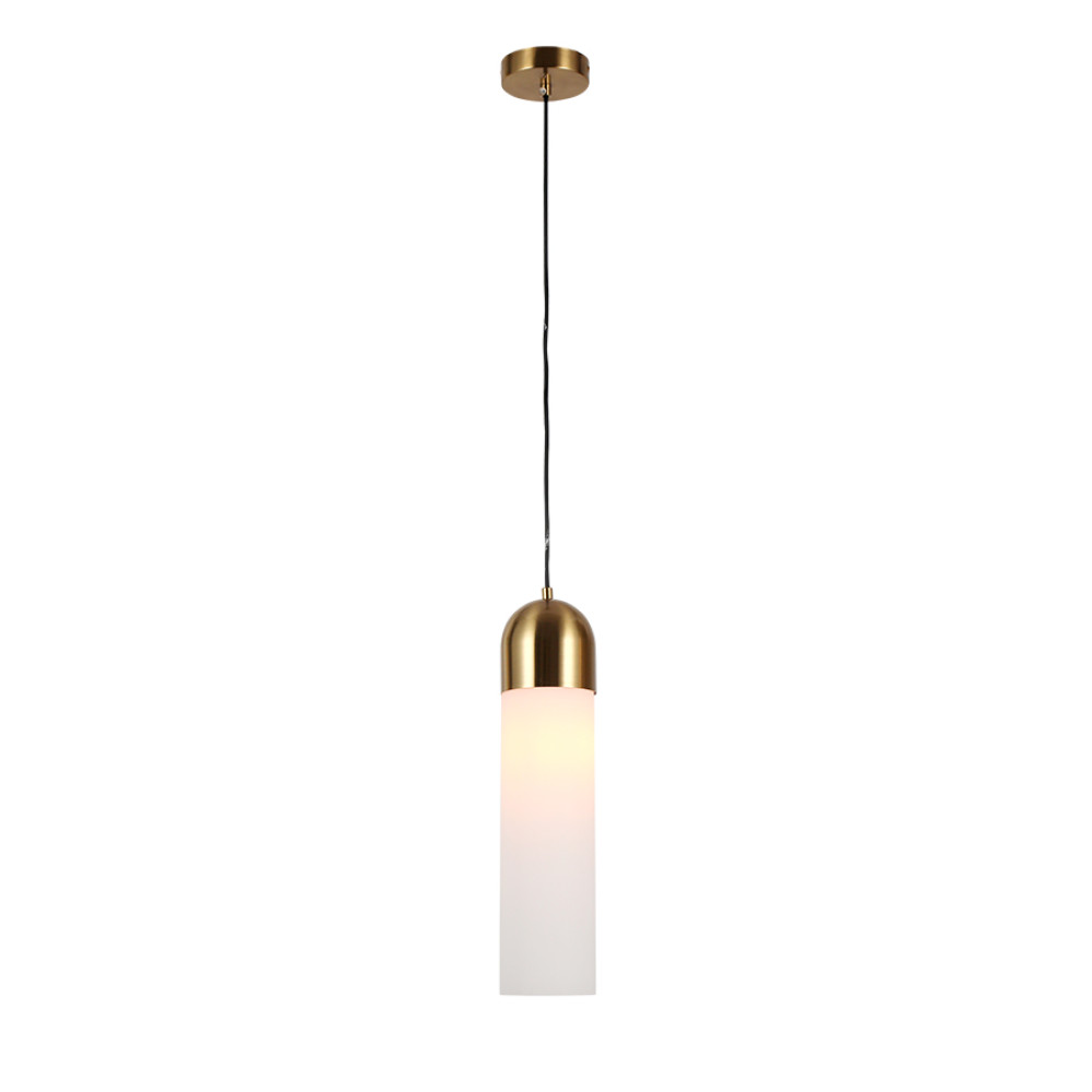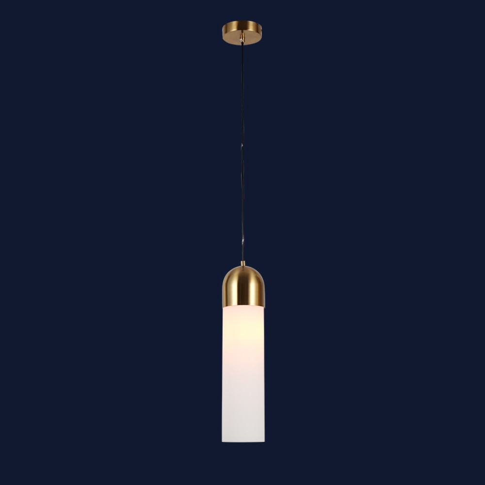 Підвісний декоративний світильник на одну лампу в сучасному стилі з плафоном циліндричної форми. Верхня частина плафона з металу, нижня – зі скла.