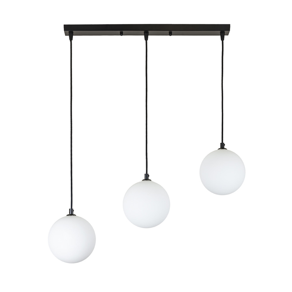 Стильний підвісний світильник на три лампи зі скляними плафонами у формі кулі.