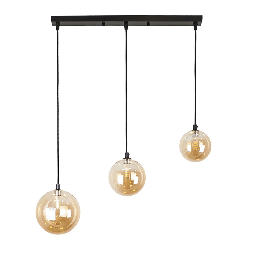 Стильний підвісний світильник на три лампи зі скляними плафонами у формі куль різних розмірів.