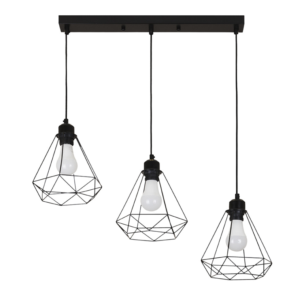 Підвісний світильник на три лампи в стилі лофт з плафонами конусної форми у вигляді металевої клітини.