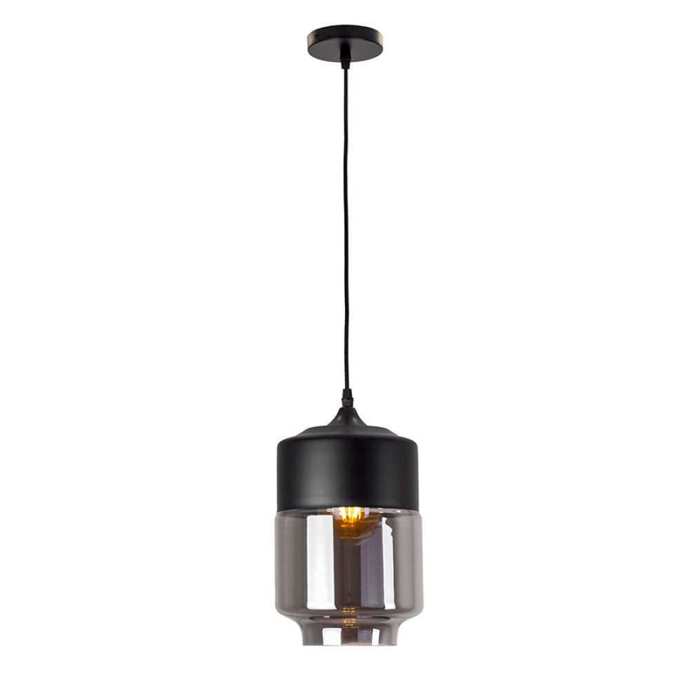 Підвісний світильник на одну лампу має скляний плафон циліндричної форми, чорного кольору. Цей дизайн ідеально вписується в стиль лофт.
