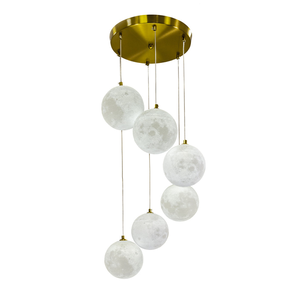 Підвісний світильник у сучасному стилі на шість ламп з декоративними пластиковими плафонами з імітацією місячної поверхні.