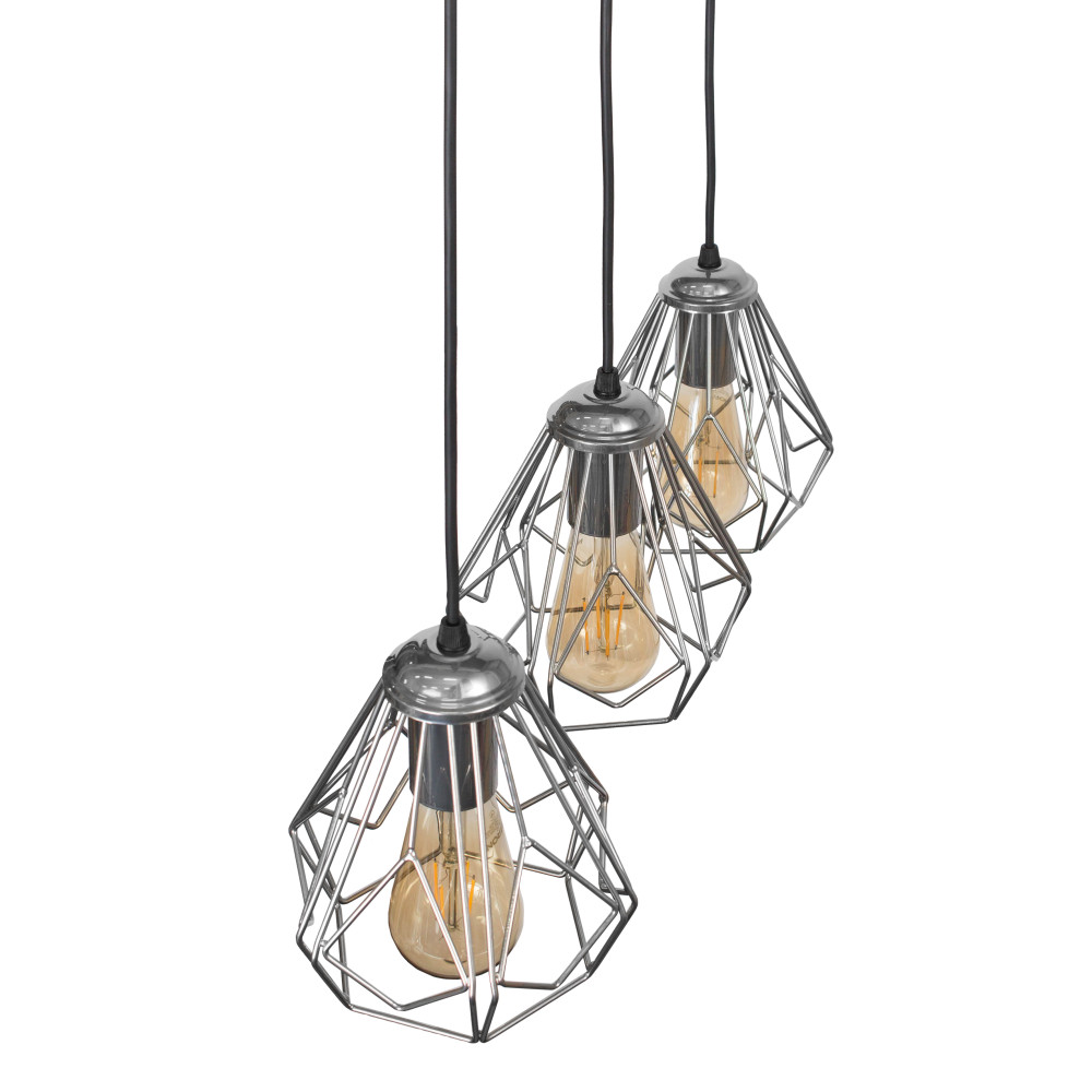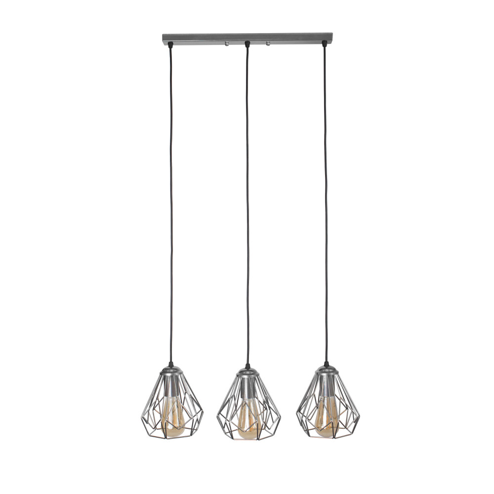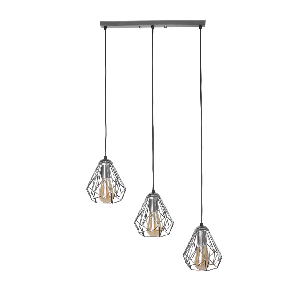 Підвісний світильник у стилі Лофт на три лампи з плафонами у вигляді металевого каркасу конусної форми. Ви можете самостійно виставити потрібну довжину дроту на кожен плафон.