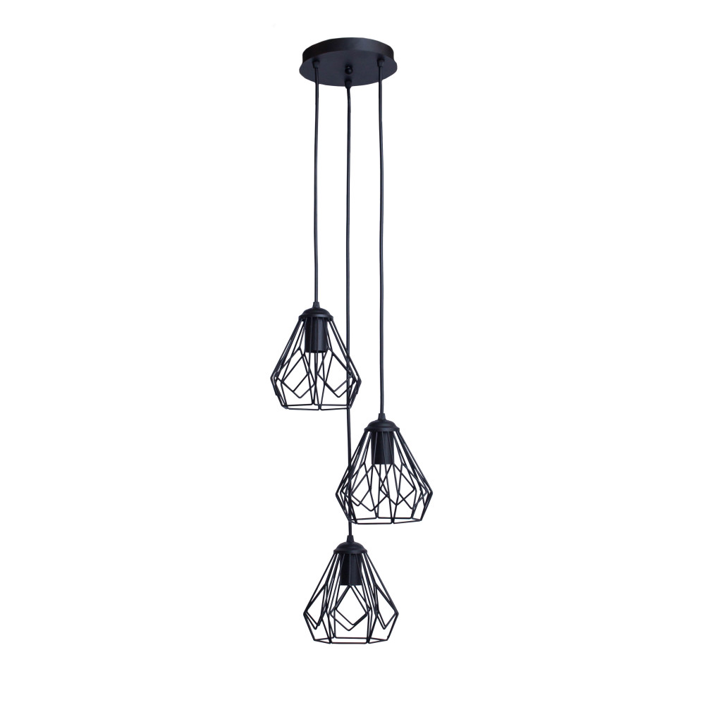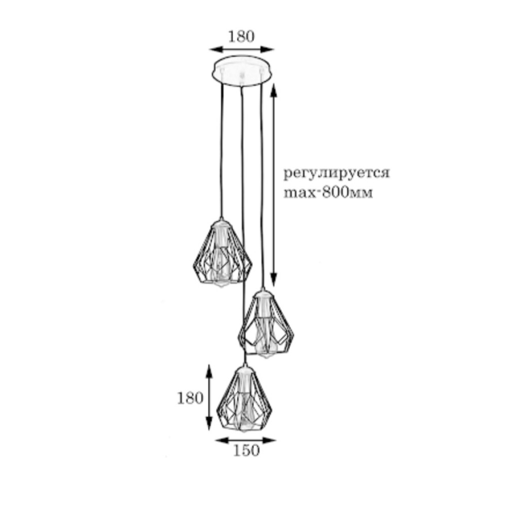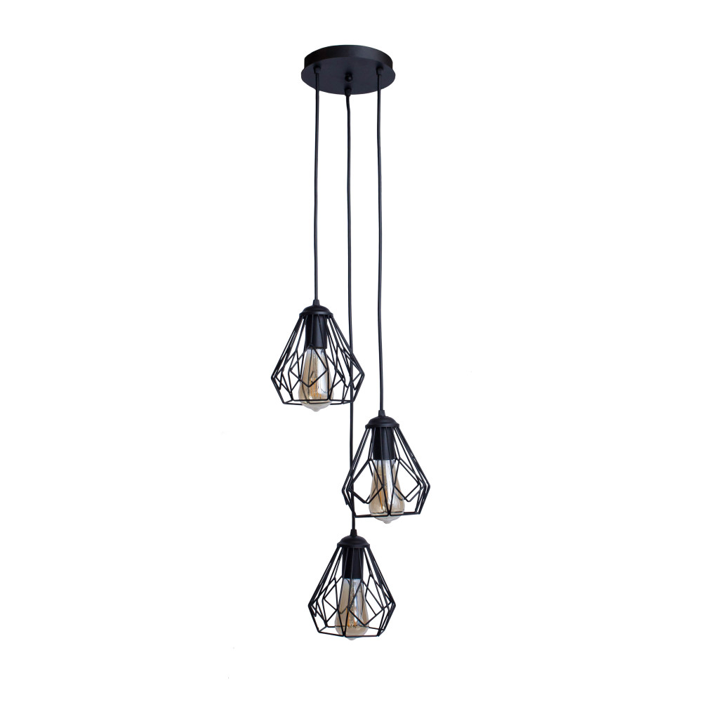 Підвісний світильник у стилі Лофт на три лампи із плафонами у вигляді металевого каркасу конусної форми. Ви можете самостійно виставити потрібну довжину дроту на кожен плафон.