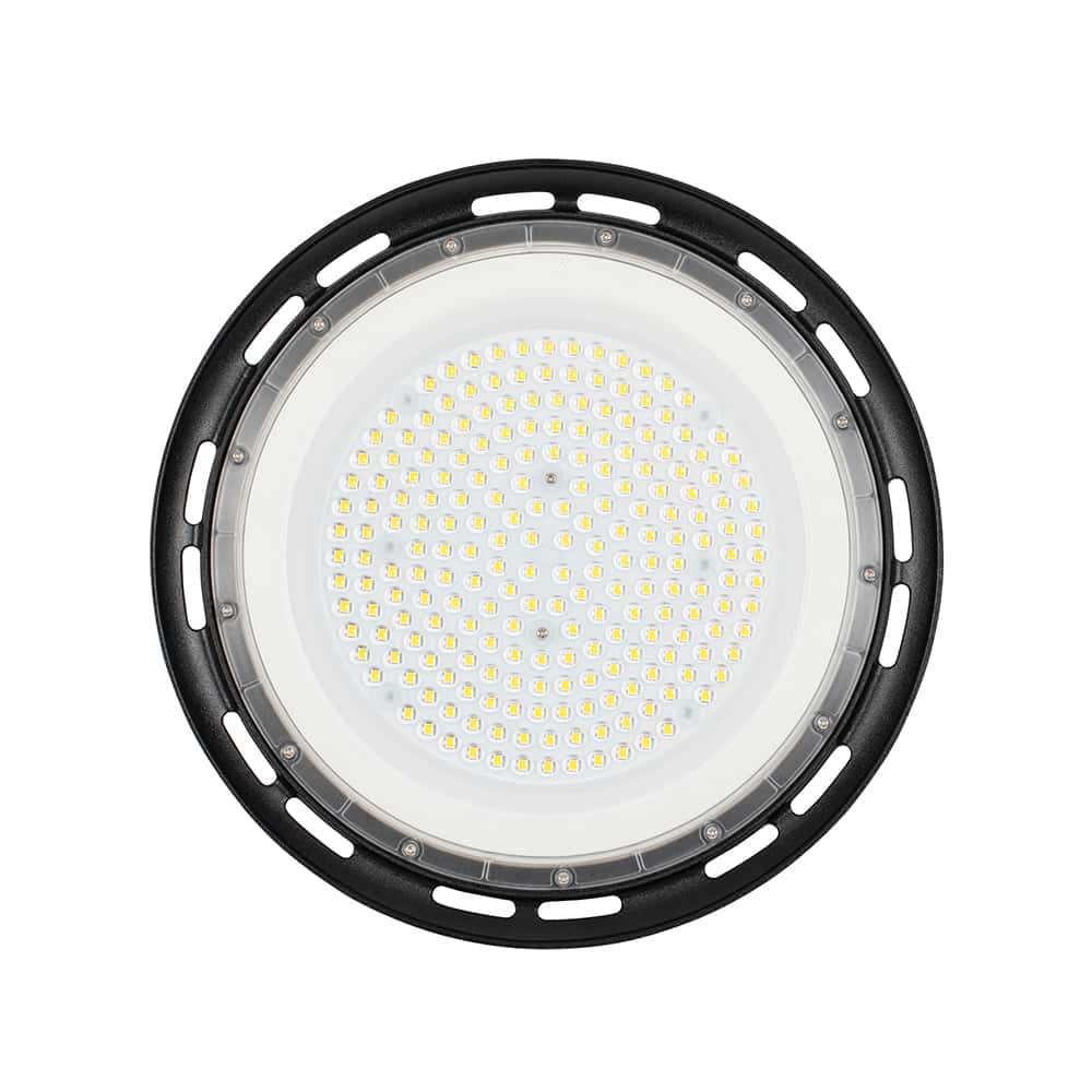 Підвісний промисловий світлодіодний вологозахищений світильник круглої, плоскої форми, має денний колір освітлення.
