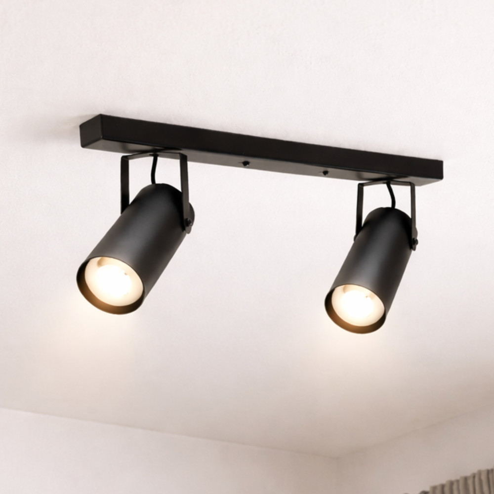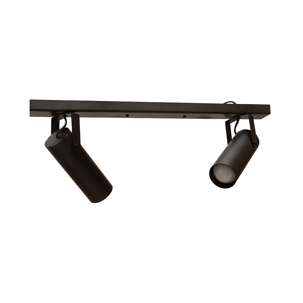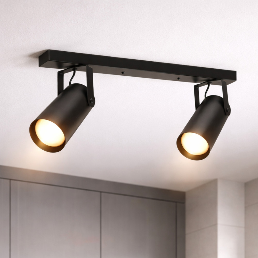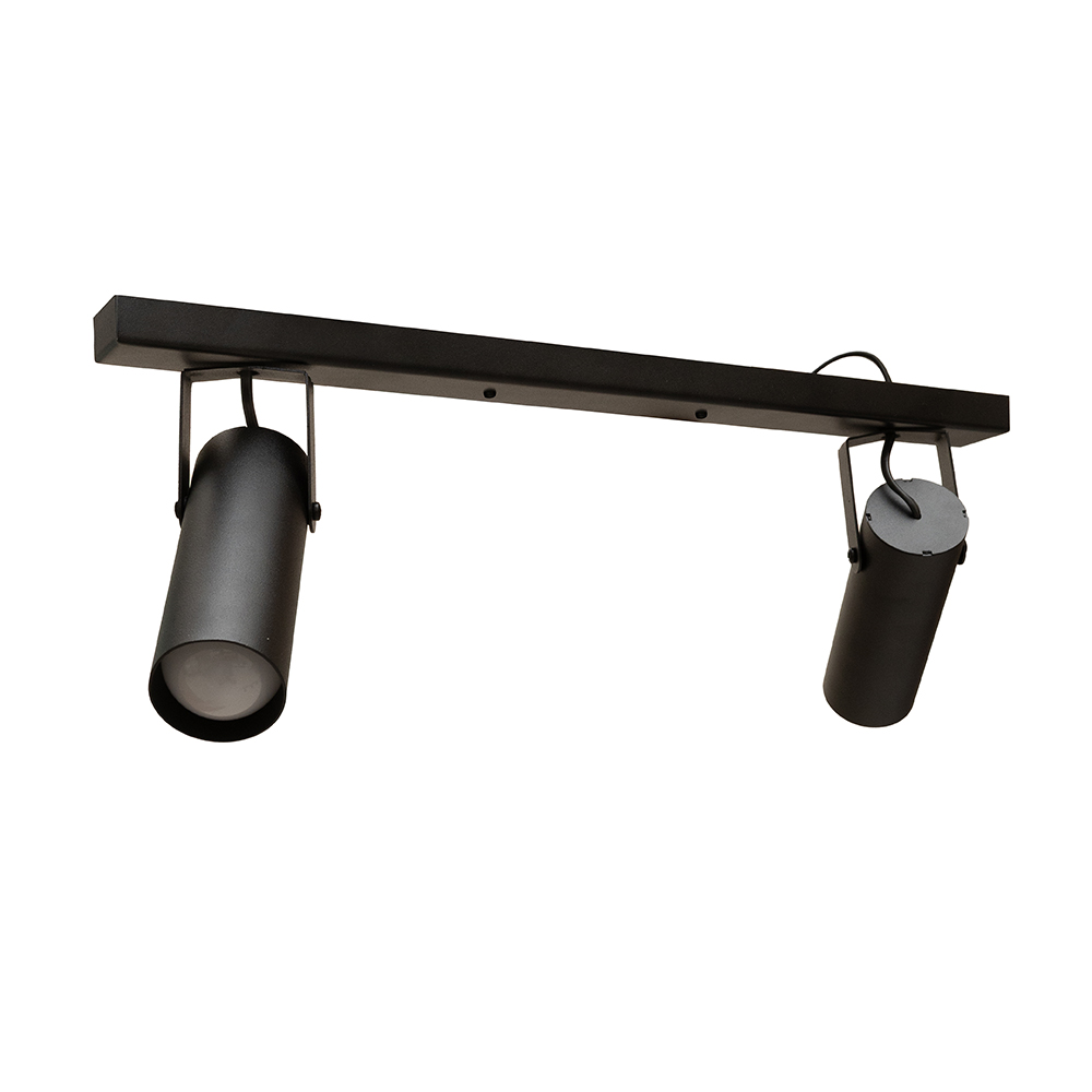 Сучасний стельовий світильник спот на дві лампи з довгим металевим корпусом і поворотними плафонами циліндричної форми. Цей світильник буде доречним для освітлення 6 м² приміщення, може використовуватися як додаткове так і основне джерело освітлення, відмінно підійде для невисоких стель.